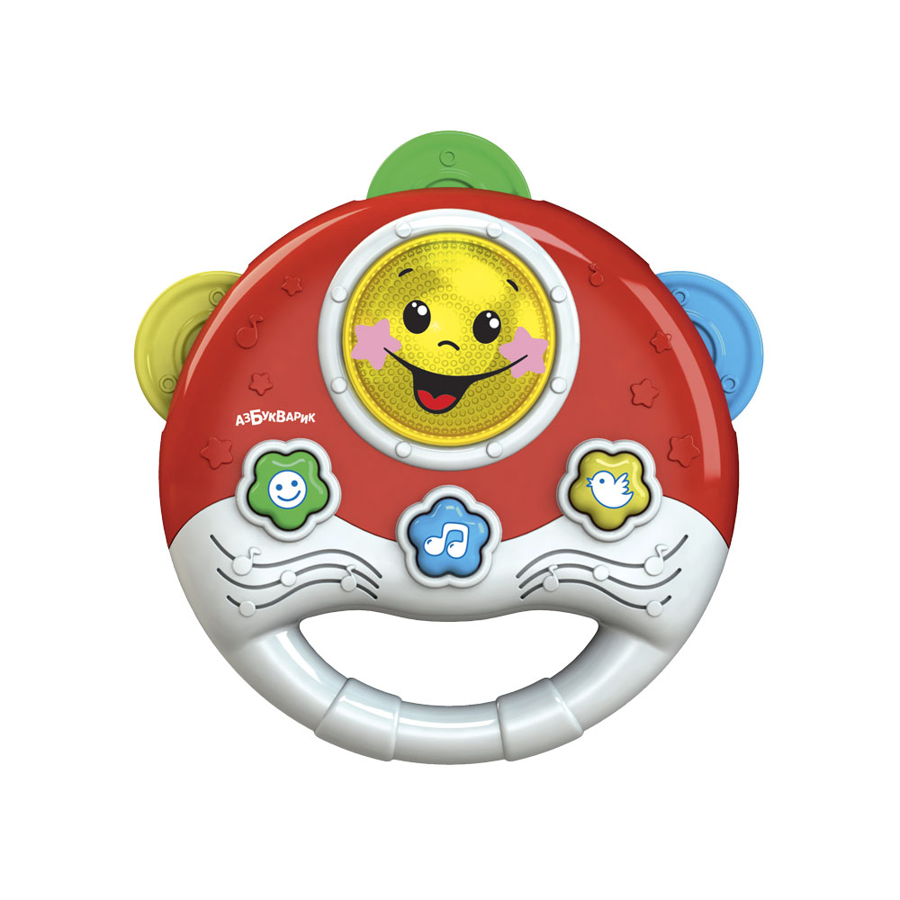 Яркий игрушечный бубен подарит малышу отличное настроение и поможет ему раскрыть музыкальный талант! Нажимай на кнопочки – слушай 25 песенок, мелодий и звуков («Если весело живётся, делай так», «Добрый жук», «Чики-чики-чикалочки», «Солнышко-колоколнышко», «Серенький козлик», «Гуси-гуси, га-га-га», «У медведя во бору», «Сорока-белобока», «Весёлая полька», «Танец зверят» и др.).