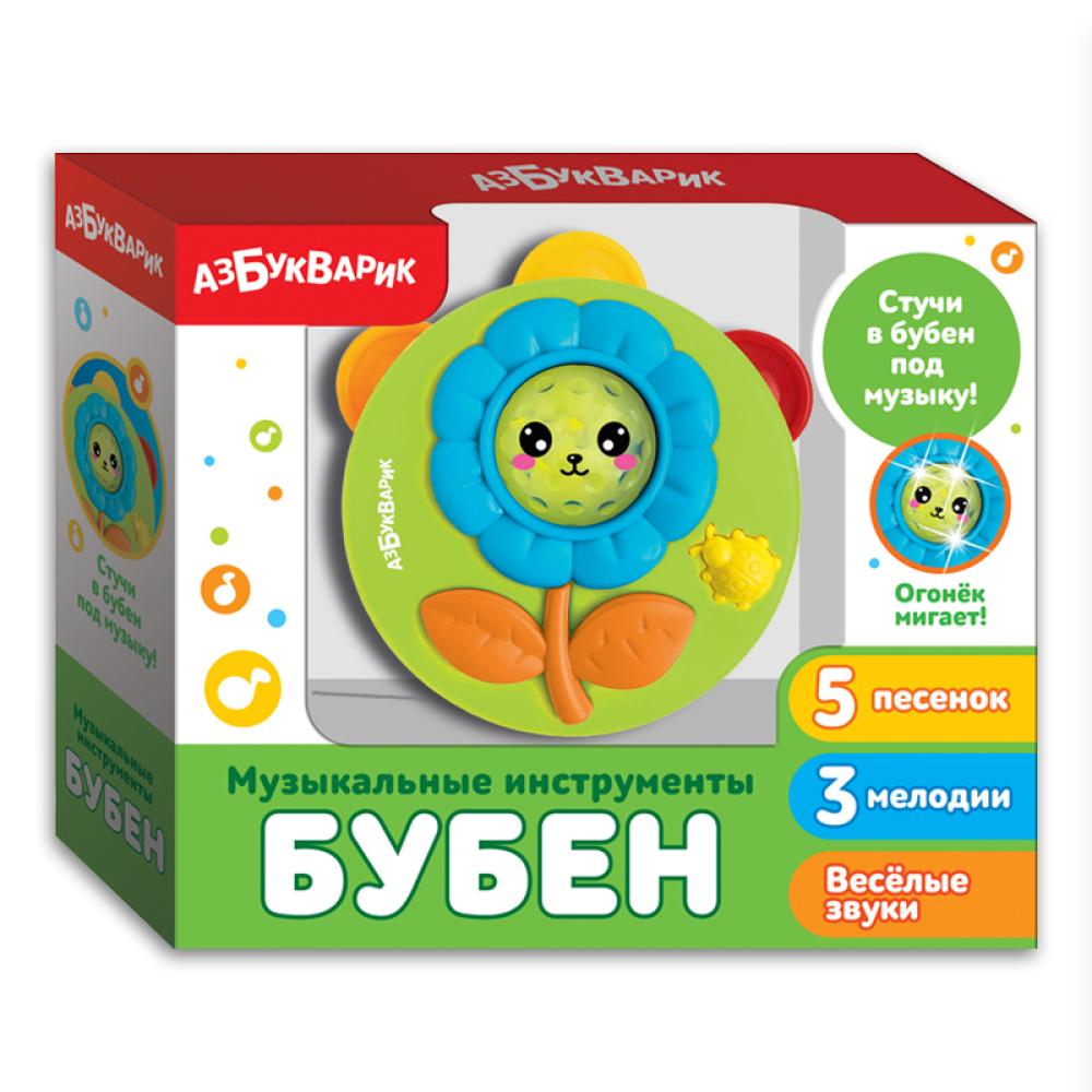 С ярким бубном малыш почувствует себя настоящим музыкантом! Слушать любимые песенки ("Антошка", "Добрый жук", "Весёлая карусель", "Ладушки", "Два весёлых гуся") и мелодии ("Танец зверят", "Весёлая полька", "Валенки") и смотреть, как светится огонёк, так весело!