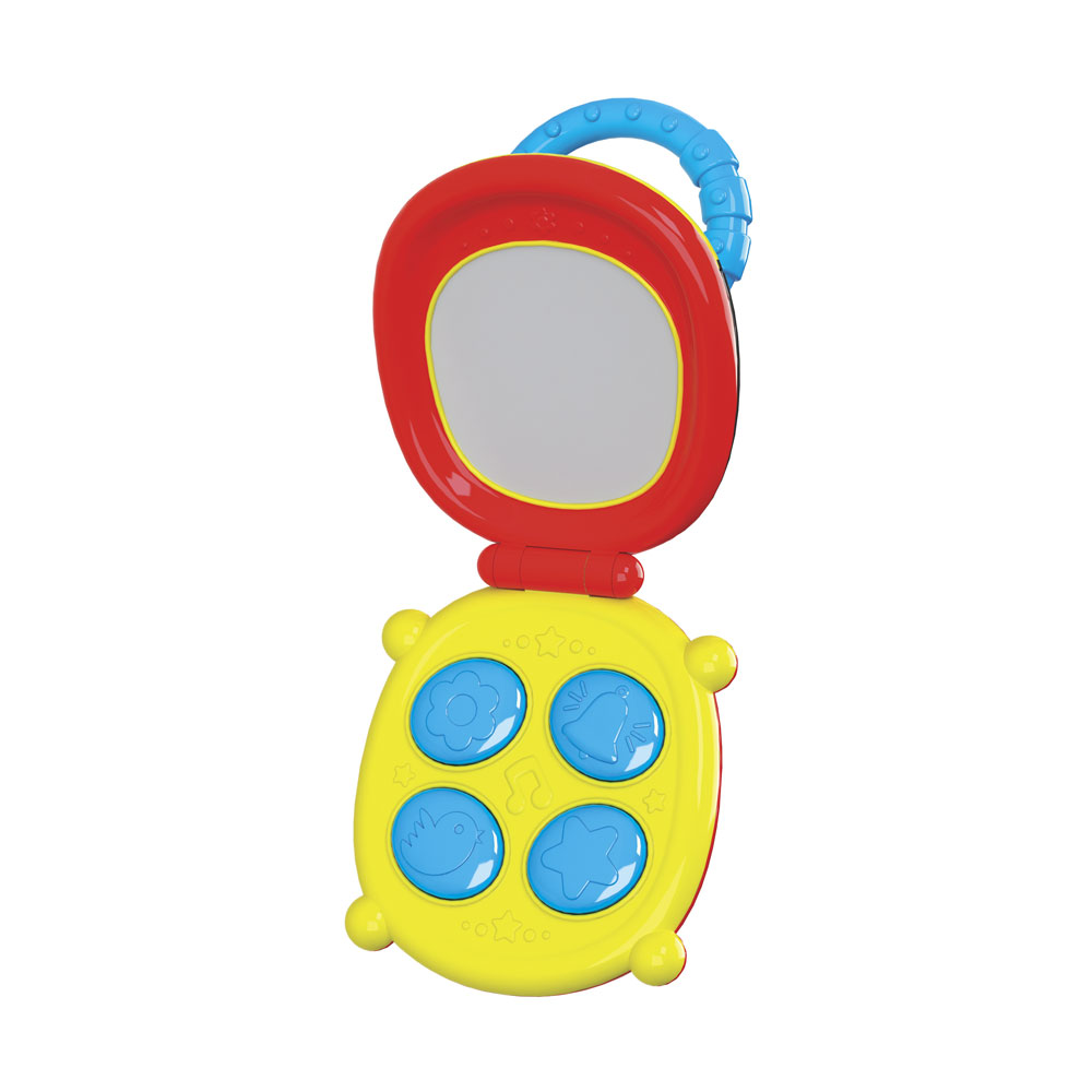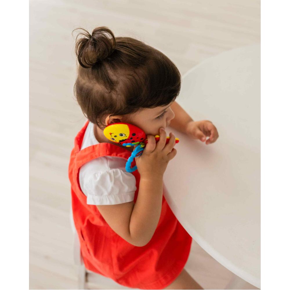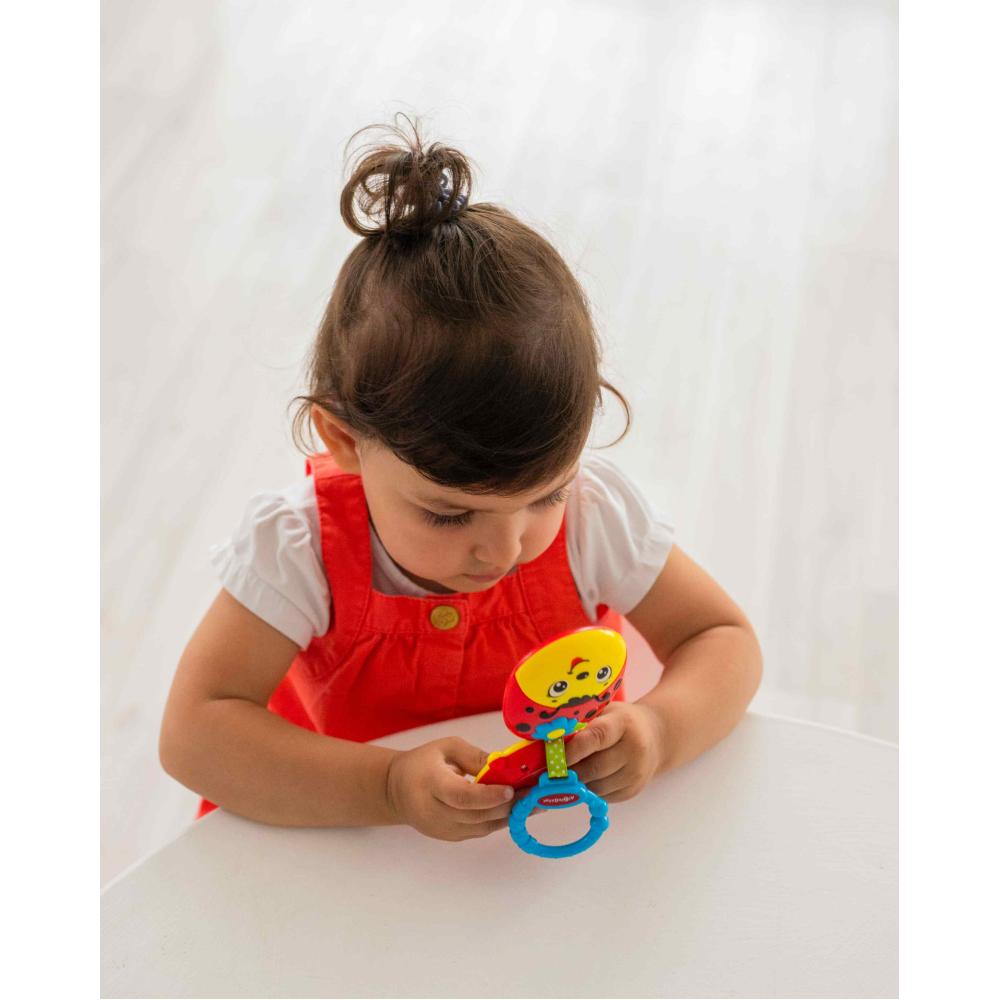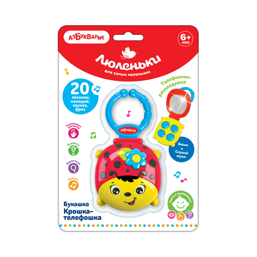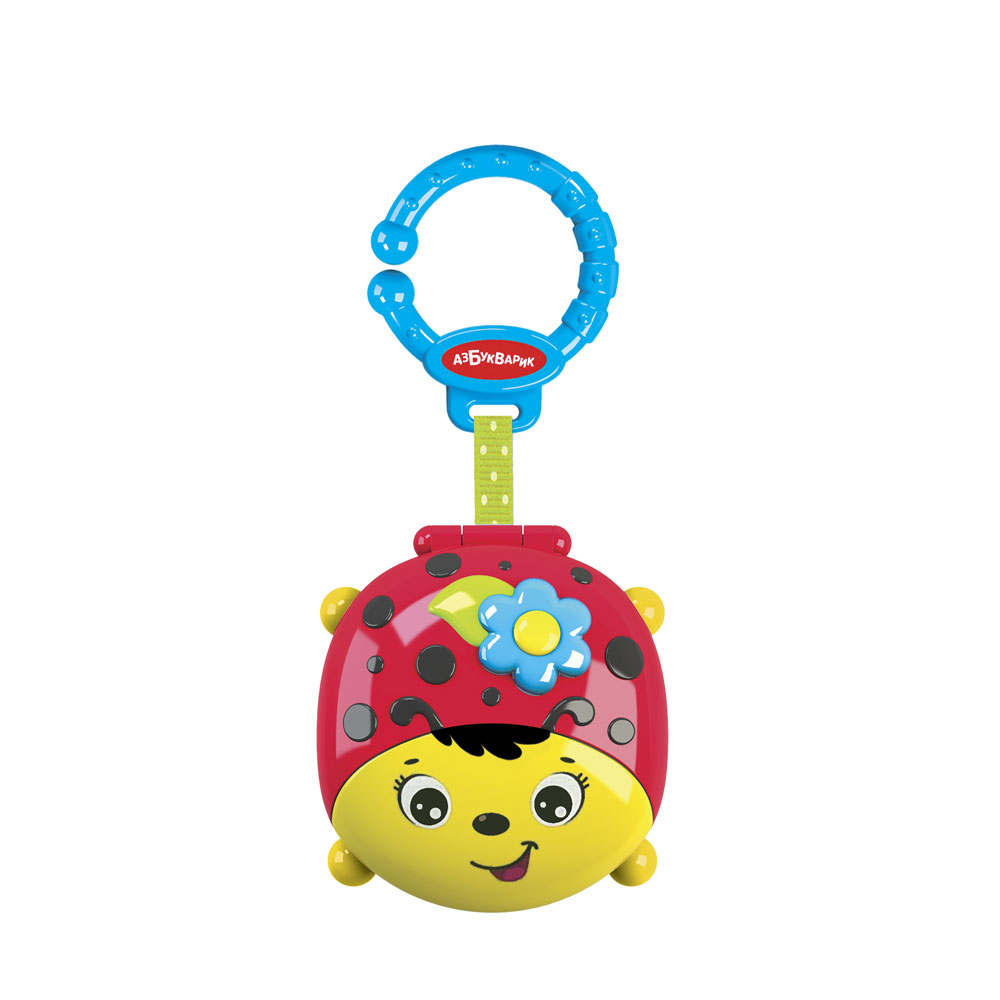 Музыкальная подвеска-телефончик в виде забавной божьей коровки – для малышей от 6 месяцев! Крышечка телефончика открывается и закрывается, а тактильные кнопочки развивают пальчики ребенка. При нажатии на кнопочки можно послушать веселые звуки, обучающую песенку про счет, забавные песенки и мелодии («Божья коровка», «Прятки», «Добрый жук» и др.). С обратной стороны крышечки расположено безопасное зеркальце, которое блестит и привлекает внимание крохи. Благодаря удобной подвеске игрушку легко прикрепить к коляске или кроватке.