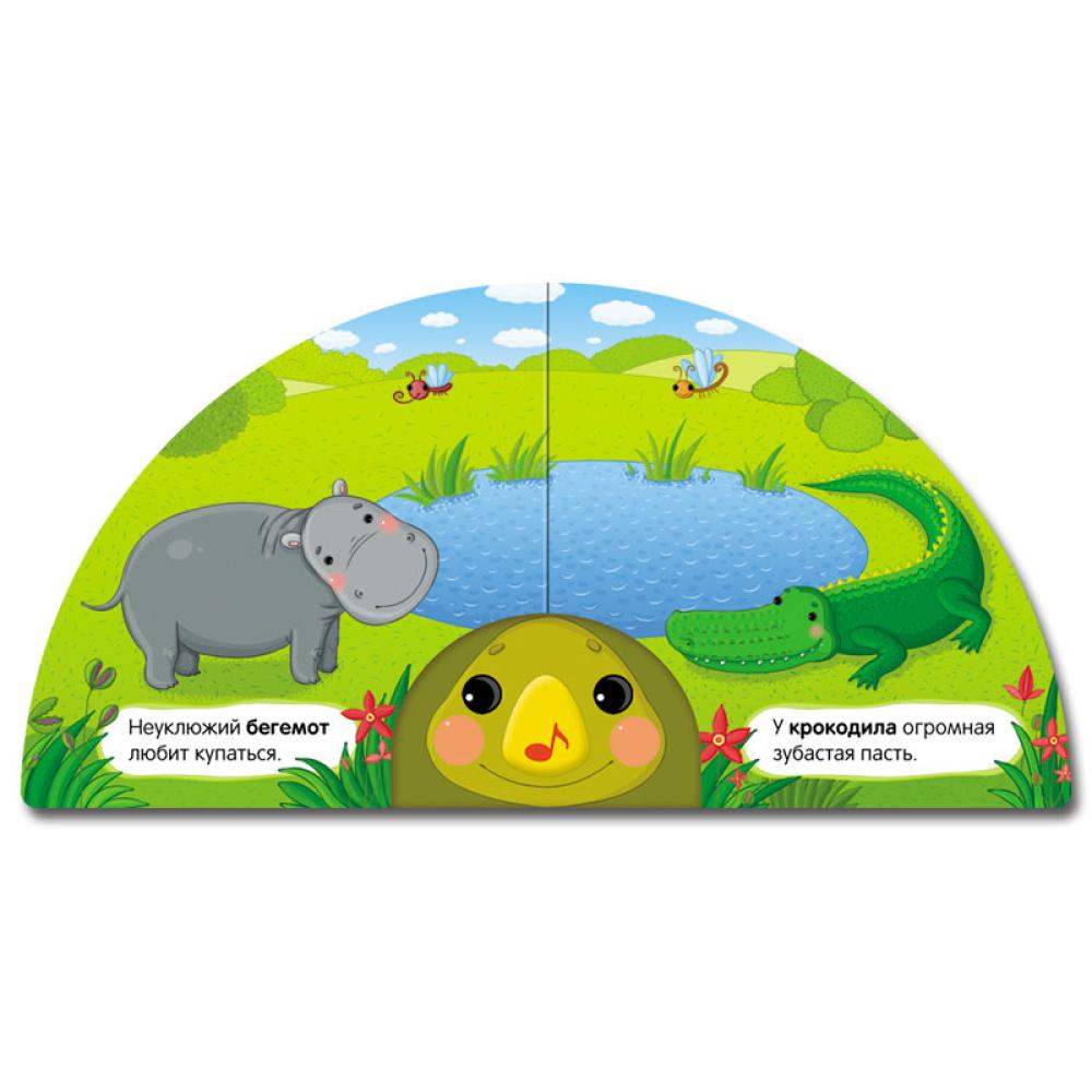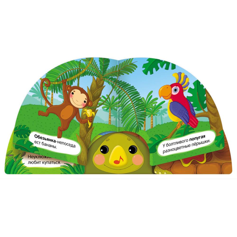 Забавная книжка в виде черепашки познакомит малышей с обитателями зоопарка – слоном, тигром, жирафом и многими другими. Ее так удобно листать в обе стороны маленькими детскими ручками! А если нажать на носик черепашки – она споет веселую песенку о себе и своих друзьях.
