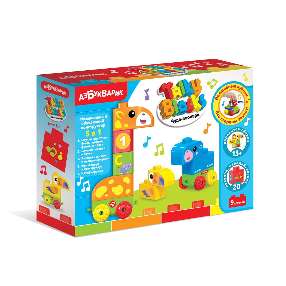 В игровом наборе «Чудо-зоопарк» малыш найдет 8 блоков с картинками, музыкальную каталочку, инструкцию. По инструкции можно собрать симпатичных обитателей зоопарка: жирафа, тукана и бегемота. Но еще интереснее комбинировать детали между собой и собирать разных фантастических животных! Все стороны кубиков – говорящие и музыкальные. Поворачивая кубики на каталочке, ребенок будет слушать песенки про зверят зоопарка, обучающие песенки про алфавит, счет, формы и противоположности, голоса животных и разные забавные звуки. Все картинки звучат!