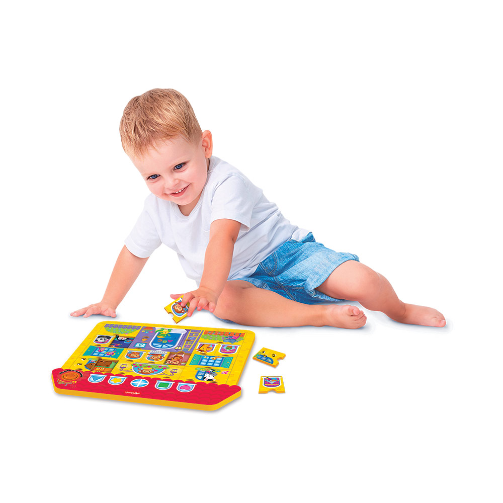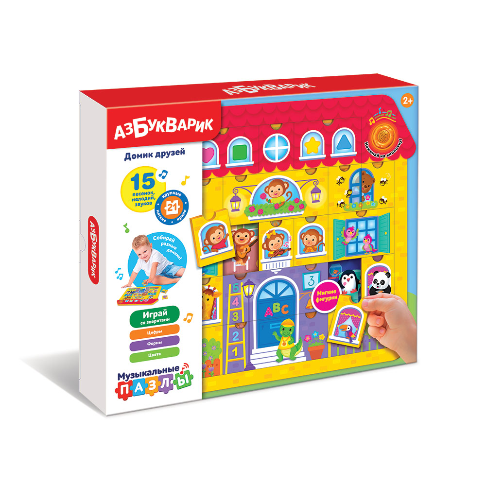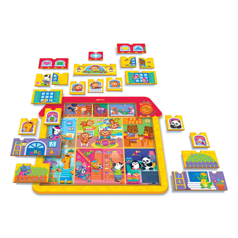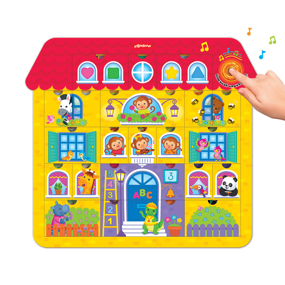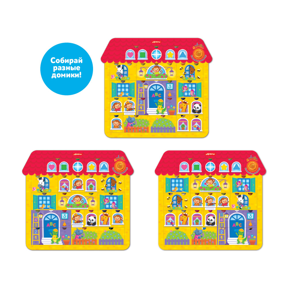 Собирать пазлы под музыку еще интереснее! При нажатии на кнопочку малыш послушает 5 веселых песенок («Наш весёлый шумный дом», «Давай играть и не скучать», «Бум-Бум», «Прятки», «Друзья»), забавные мелодии и звуки.