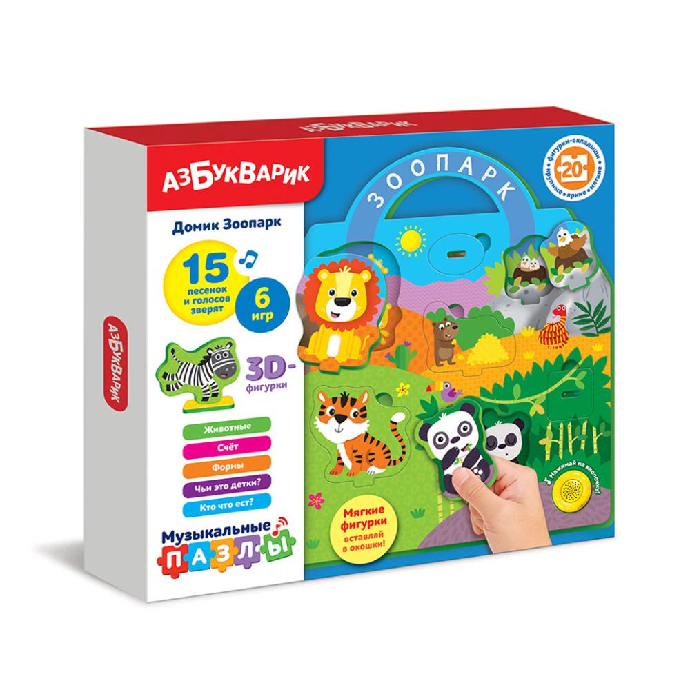 Вставляя мягкие фигурки в нужные окошки, малыш познакомится со зверюшками зоопарка, выучит цифры и формы. Родители могут поиграть вместе с ребенком в обучающие игры: «Считалочка», «Загадки про животных», «Логическая цепочка из фигурок» и др. Такие занятия развивают память, логическое мышление, мелкую моторику. Фигурки животных можно поставить на подставки – и разыграть настоящее театральное представление.