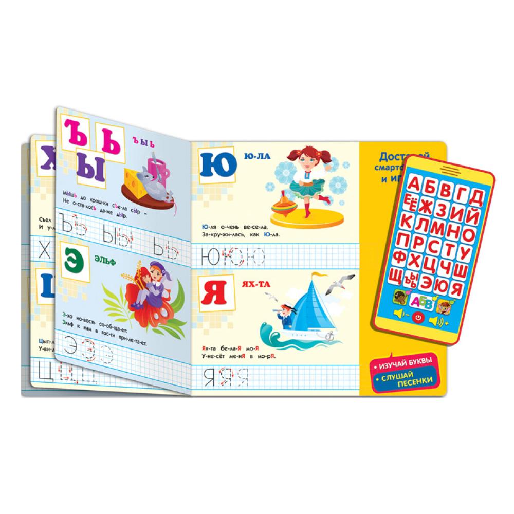 Эта азбука с говорящим смартфончиком поможет ребёнку быстро и легко запомнить алфавит. Малышу нужно только нажимать на кнопочки – и он услышит звуки и слова. Родители вместе с детьми почитают буквы на страничках. А ещё смартфончик можно достать из книжки, играть с ним и слушать песенки!