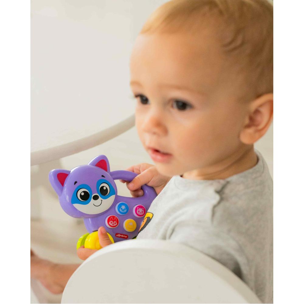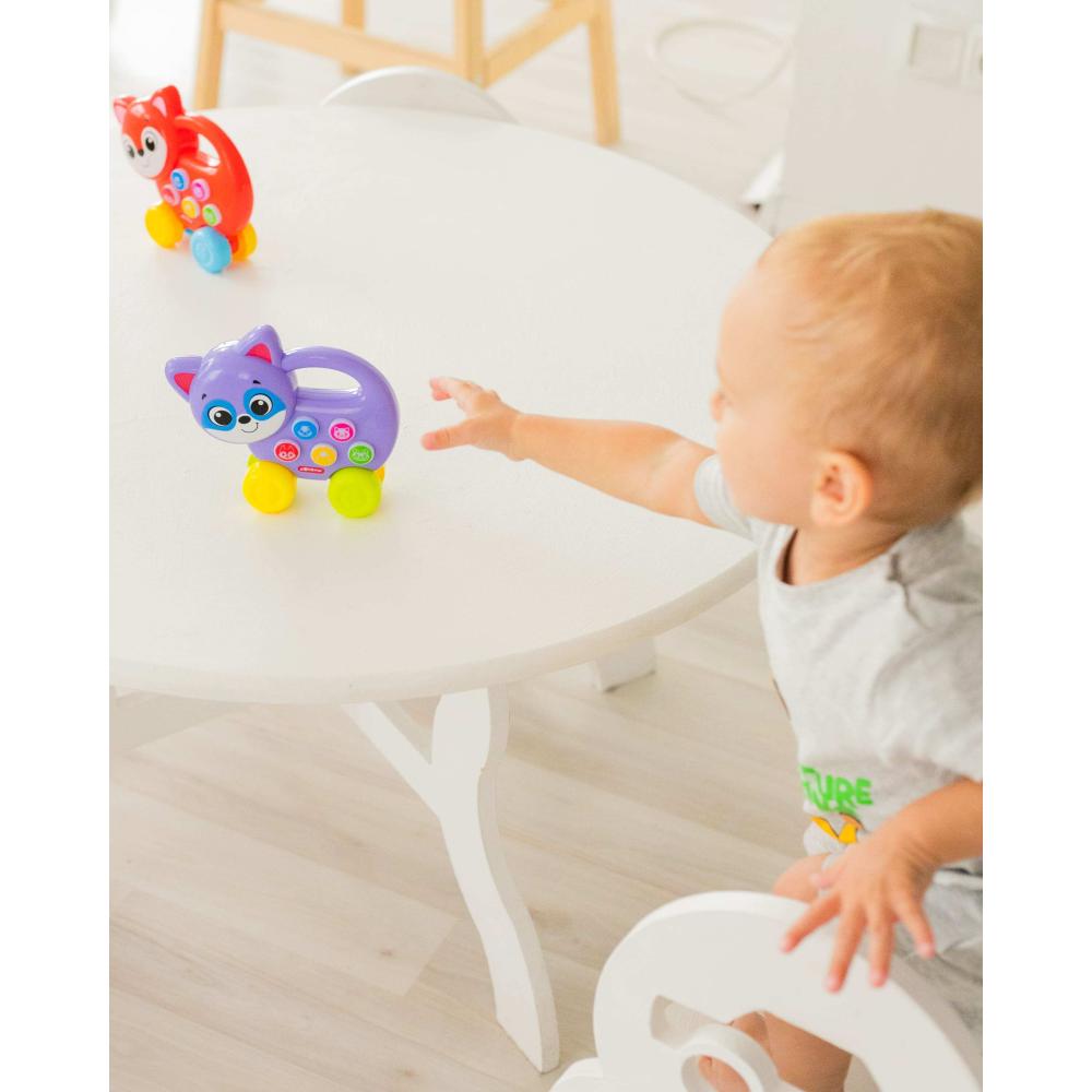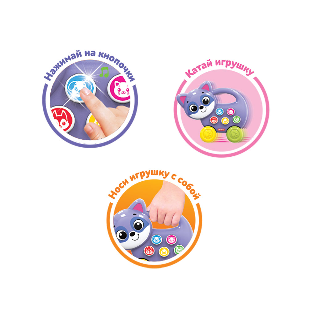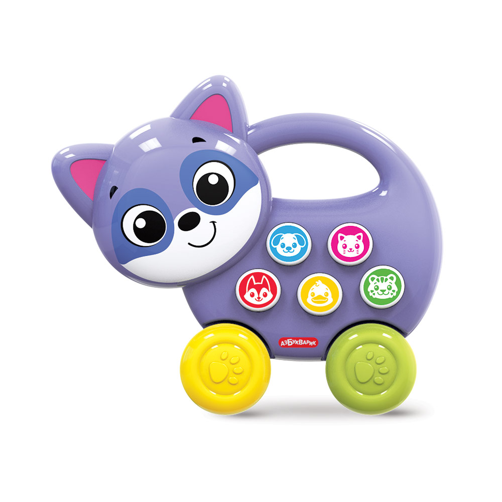 Музыкальная игрушка 2 в 1 – плеер-енотик + каталочка! Нажимая на кнопочки, малыш послушает популярные детские песенки («Во дворе играл щенок», «Антошка», «Песенка котёнка», «Весёлая карусель», «Ходит рыжая лиса», «Бум-Бум», «Утёнок пока не умеет нырять», «Чижик-пыжик», «Озорной тигрёнок», «Догони») и мелодии с веселыми звуками(«Собачий вальс», «Трик-трак», «Танец зверят», «Два весёлых гуся», «Арам зам зам»). Во время звучания на кнопочках мигают огоньки. А катать енотика на колесиках под музыку – это так весело! Отличная игрушка для маленьких непосед!