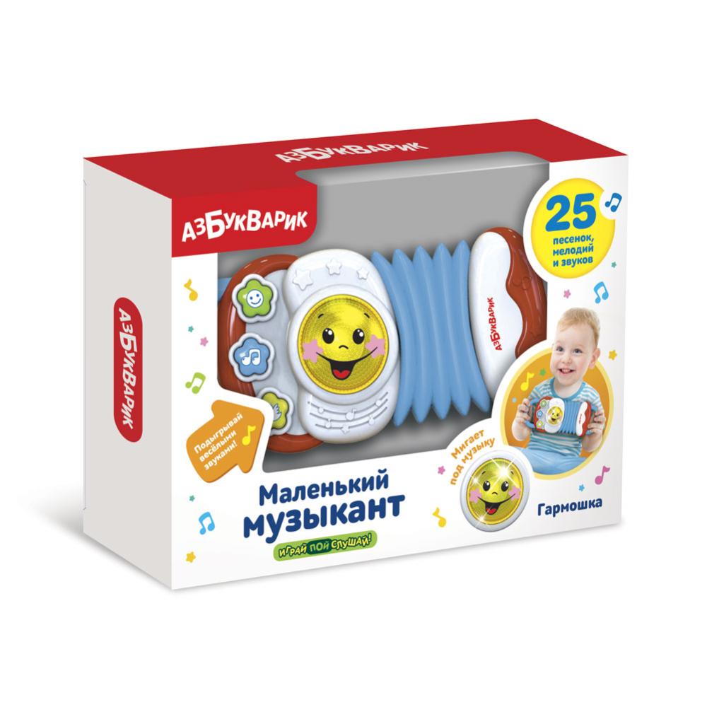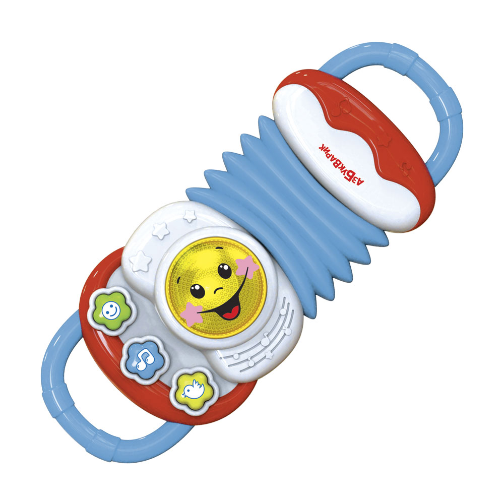 Яркая игрушечная гармошка подарит малышу отличное настроение и поможет ему раскрыть музыкальный талант! Нажимай на кнопочки – слушай 25 песенок, мелодий и звуков («Антошка», «Дождик», «Пусть бегут неуклюже», «Как у наших у ворот», «Мишка косолапый», «Зайчик серенький сидит», «Идет коза рогатая», «Сидит белка на тележке», «Калинка», «Два весёлых гуся» и др.) Во время звучания песенок и мелодий мигает огонек. А еще можно подыграть под музыку весёлыми звуками, как диджей: для этого нужно нажимать на большую желтую кнопку. Получится настоящий концерт!