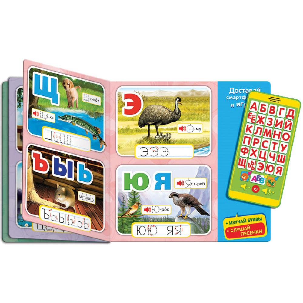 Эта азбука с говорящим смартфончиком поможет ребёнку быстро и легко запомнить алфавит. Малышу нужно только нажимать на кнопочки – и он услышит звуки и слова. Родители вместе с детьми почитают буквы на страничках. А ещё смартфончик можно достать из книжки, играть с ним и слушать песенки.