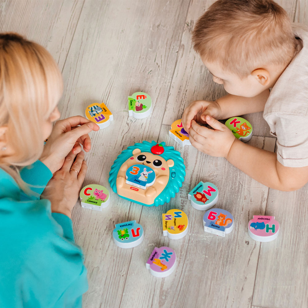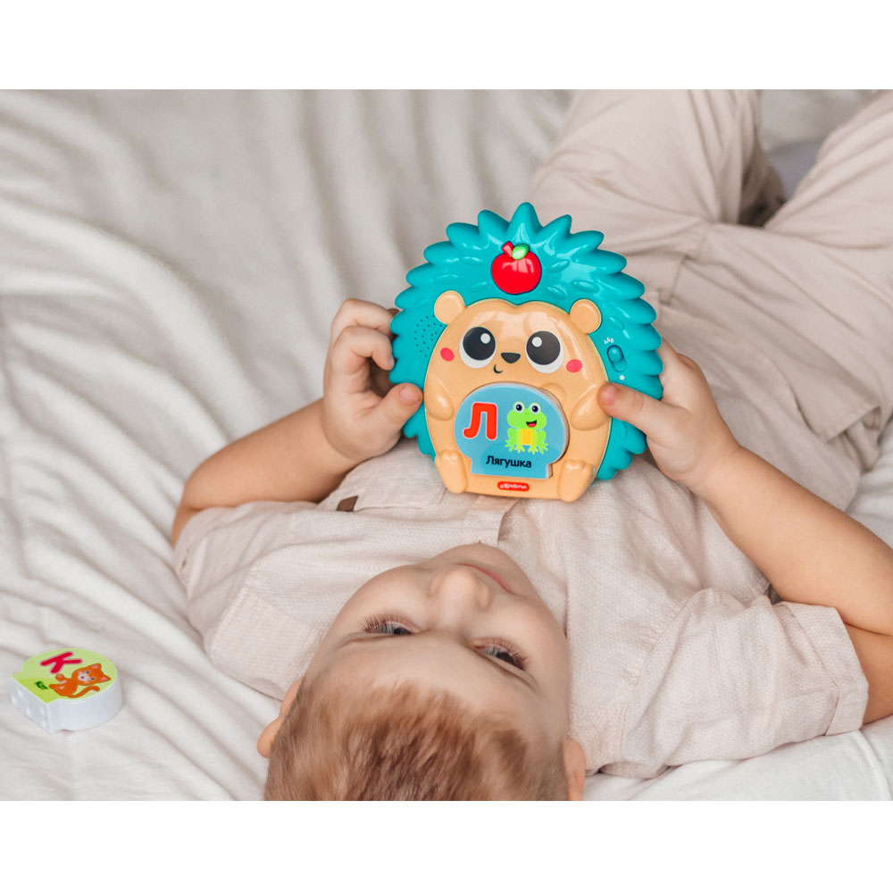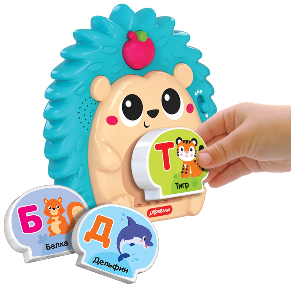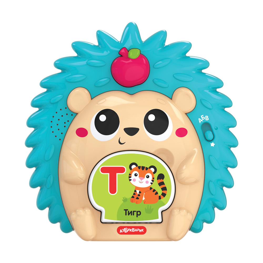 Учи алфавит вместе с говорящим ежиком! Угости его грибочком – и ежик назовет букву. Переключи режим – и запоминай, как буквы звучат. Также малыш познакомится со зверятами и услышит, как они говорят. Оба режима важны в обучении. Ребенок изучает и названия букв, и то, как они звучат. Всего у ежика 15 грибочков, буквы и картинки на них – с двух сторон. При нажатии на яблочко ежик споет 7 веселых песенок («Жил да был весёлый ёжик», «Песенка про алфавит», «Песенка про счёт», «Лето», «Друзья», «Как чудесно жить на свете», «Зарядка») и предложит поиграть в 3 игры: «Весёлые буквы», «Чей голос?», «Загадки». А еще с помощью грибочков ребенок сможет