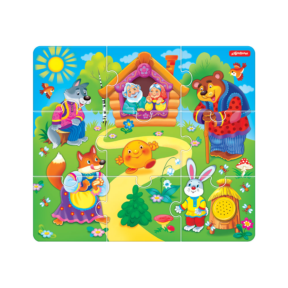 А собирать пазлы под музыку еще интереснее! При нажатии на кнопочку малыш послушает любимую сказку «Колобок», весёлую мелодию и песенку-считалочку.