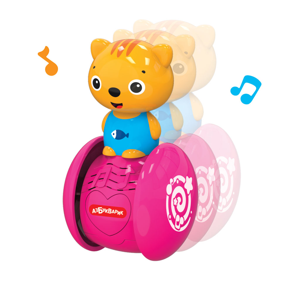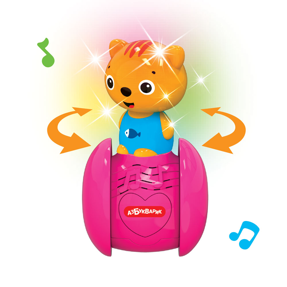 Этот забавный котенок на колёсиках такой быстрый! Попробуй догони! Катай игрушку – слушай песенки ("Чижик-пыжик", "Догони") и весёлые мелодии с забавными звуками. Яркие огоньки мигают под музыку и поднимают настроение. А еще с котенком можно играть как с неваляшкой. Такая игрушка не только развлекает малыша, но и помогает в развитии двигательной активности, слухового восприятия, музыкальных способностей.