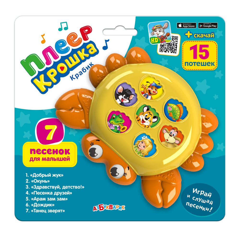 Крабик из серии «Плеер Крошка» обязательно понравится вашему ребенку, ведь он умеет петь песенки! Просто нажимай на кнопочки – слушай, пой и танцуй! С такой игрушкой будет весело и дома, и в гостях, и на прогулке!