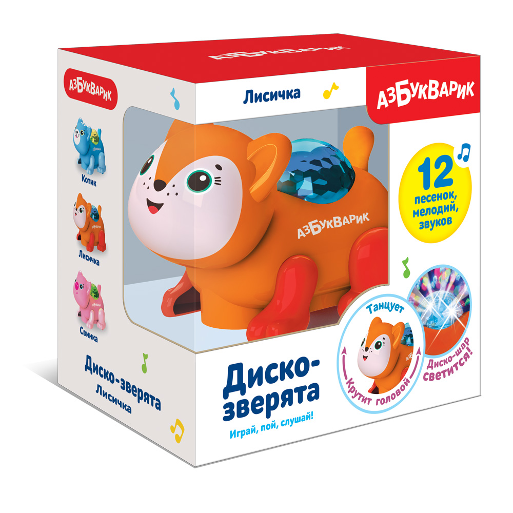 Диско-зверята приглашают на детскую вечеринку! Симпатичная лисичка задорно танцует под музыку – малышу захочется потанцевать с ней вместе! Нужно просто включить игрушку – и зазвучат веселые песенки и мелодии с забавными звуками («Если нравится тебе, то делай так», «Антошка», «Пляшут весело детишки», «Арам зам зам», «Песенка про кузнечика», «Собачий вальс», «Танцевальная мелодия»). Лисичка крутит головой под музыку, а на спинке у нее есть настоящий диско-шар, который светится разноцветными огоньками.