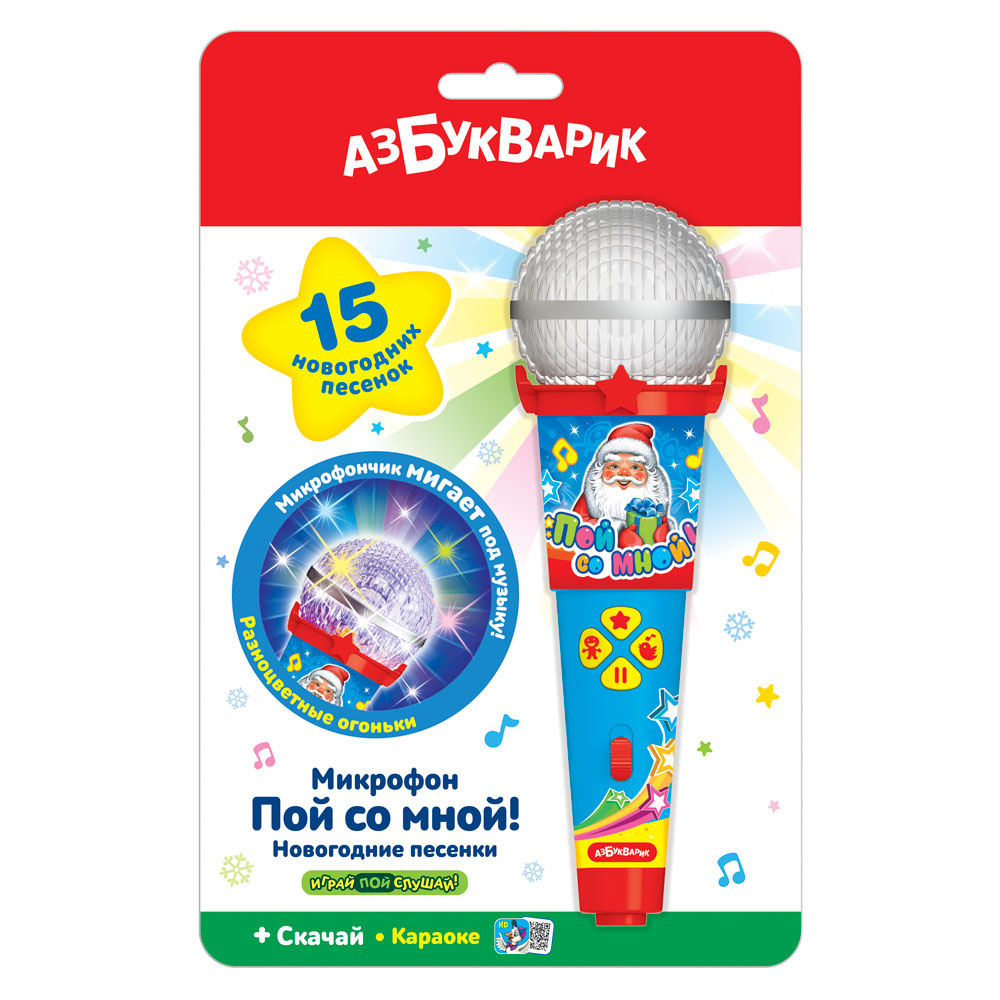 Этот удивительный микрофон превратит новогодний праздник в настоящее шоу! Он светится под музыку, как настоящий диско-шар! Слушай и пой 15 детских хитов («Ёлочка», «Белые снежинки», «Песенка Деда Мороза» и др.).