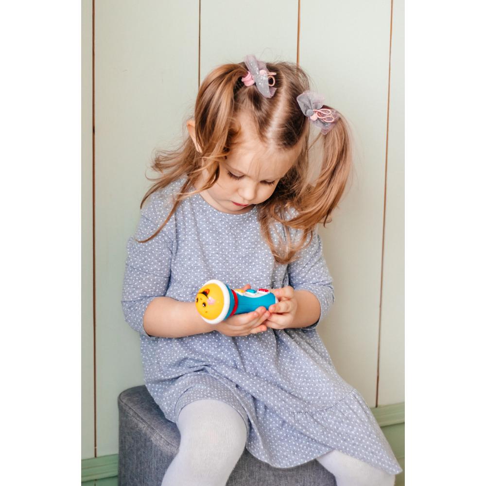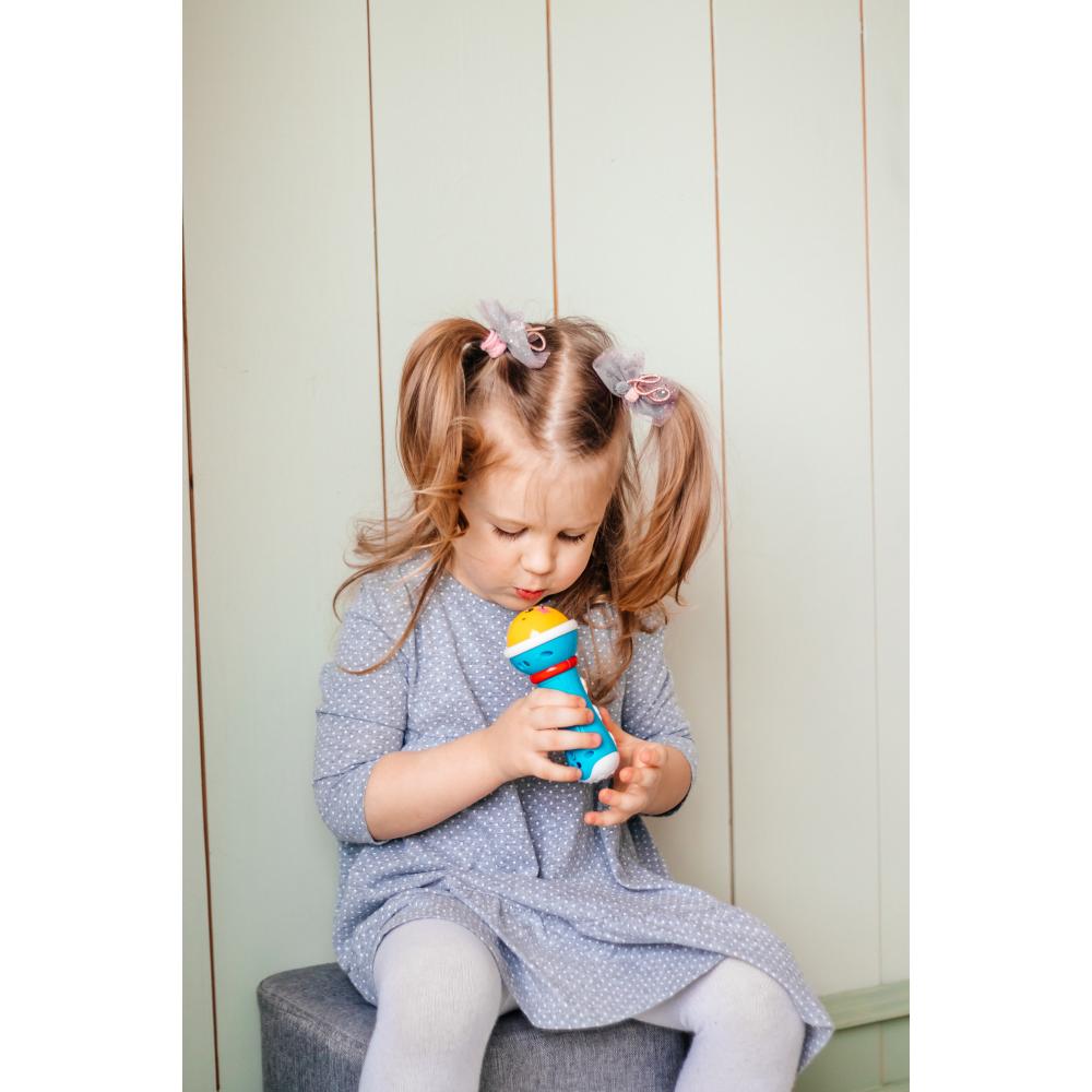 Яркий игрушечный микрофончик подарит малышу отличное настроение и поможет ему раскрыть музыкальный талант! Нажимай на кнопочки – слушай 20 песенок и веселых звуков («Песенка Мамонтёнка», «Здравствуй, детство!», «Четыре таракана и сверчок», «Расскажи, Снегурочка», «Чуку-чу», «С днем рожденья», «Калинка», «Заинька, попляши!», «Петушок», «Топ-топ, топотушки» и др.).