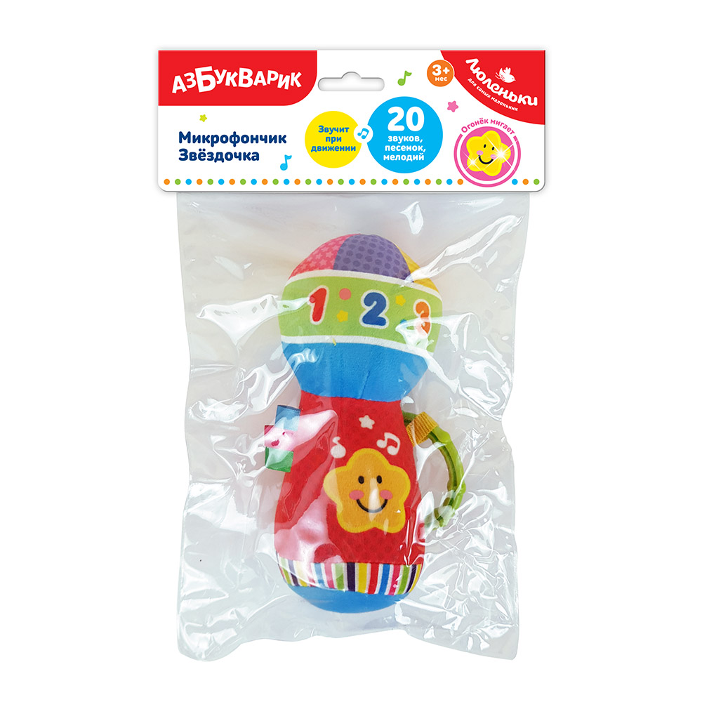 Микрофончик звучит при движении. Малыш послушает популярные песенки («Пляшут весело детишки», «Лесная считалочка», «Бум-Бум») и мелодии с забавными звуками («Немецкая полька», «Кукарача», «Песенка про кузнечика»). Звездочка на микрофончике светится и привлекает внимание малыша, помогает ему научиться фокусировать взгляд. Яркие атласные ленточки приятно трогать пальчиками. Игрушка отлично подходит для малышей от трех месяцев, развивает слуховое, зрительное и тактильное восприятие.