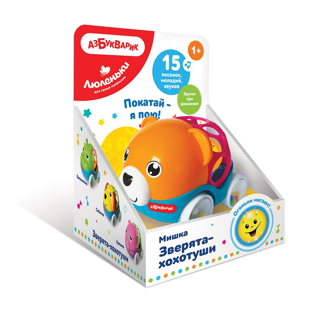 Покатай забавного мишку – он звучит при движении! Слушай веселые песенки («Давай играть и не скучать», «Зверюшки», «Догони»), мелодии и звуки.