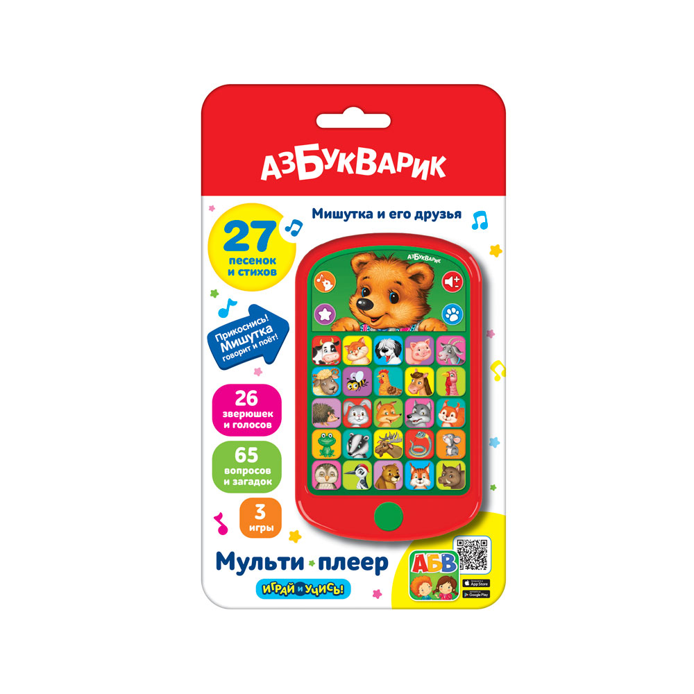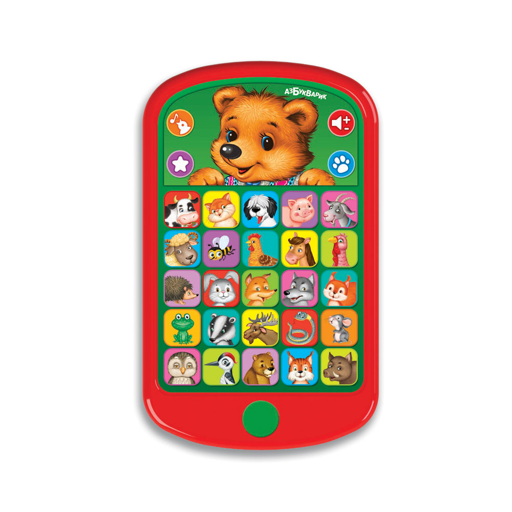 Новинка в серии «Мульти плеер»! 65 вопросов и загадок, 26 зверюшек и голосов, 3 игры - всё это ждёт малышей в новом смартфончике! Нажми на большую картинку – Мишутка говорит и поёт.