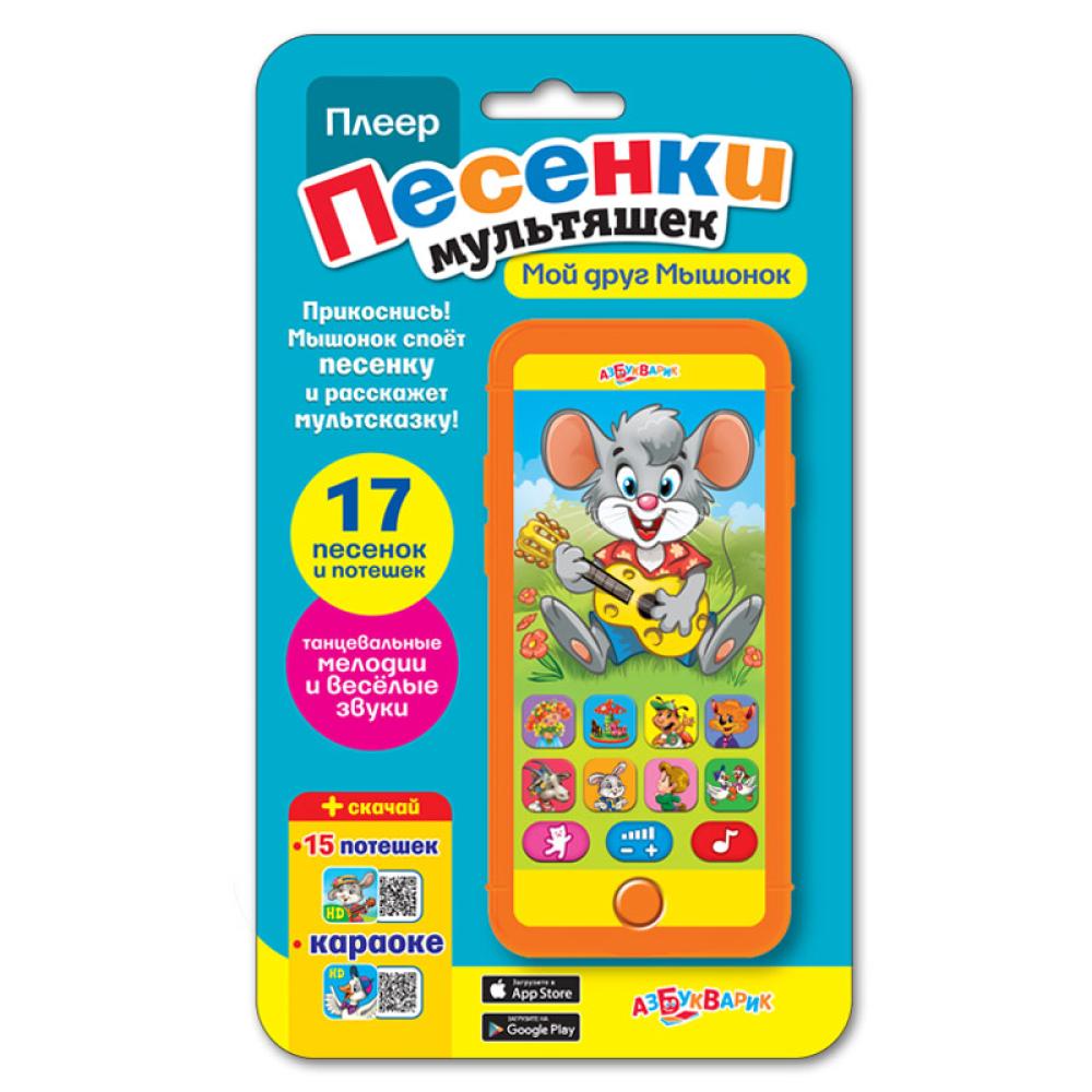 Интерактивный плеер-смартфончик с любимыми мультяшками! Прикоснись к Мышонку, и он расскажет сказку и споёт песенки: «Какой чудесный день!», «Мир похож на цветной луг», «Песенка о лете», «Карусельные лошадки», «Что такое цирк?», «Песенка про кузнечика», «Если добрый ты», «Танец маленьких утят», «Добрый жук».