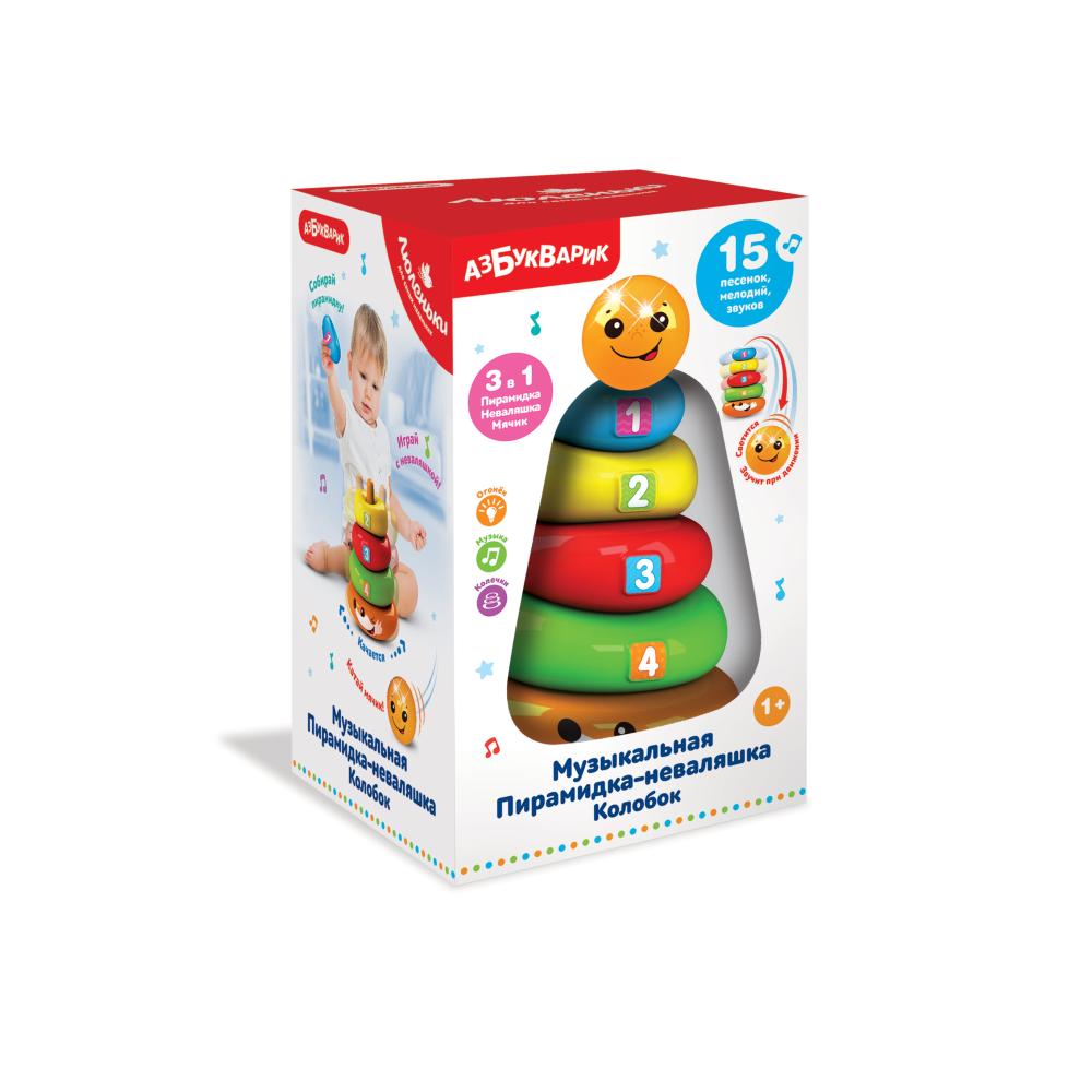 Музыкальная игрушка 3 в 1: пирамидка, неваляшка и мячик! Собери пирамидку из разноцветных колечек, а на вершину положи мячик в виде колобка! Собрал пирамидку? Поиграй с ней, как с неваляшкой – она качается в разные стороны. Катай мячик – он звучит при движении! Слушай веселые песенки и мелодии («Много есть цветов прекрасных», «Прятки», «Песенка про счёт», «Чижик-пыжик», «Немецкая полька» и др.), забавные звуки. Огоньки на мячике мигают под музыку и дарят отличное настроение.