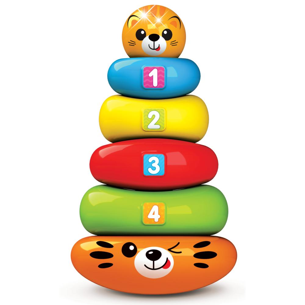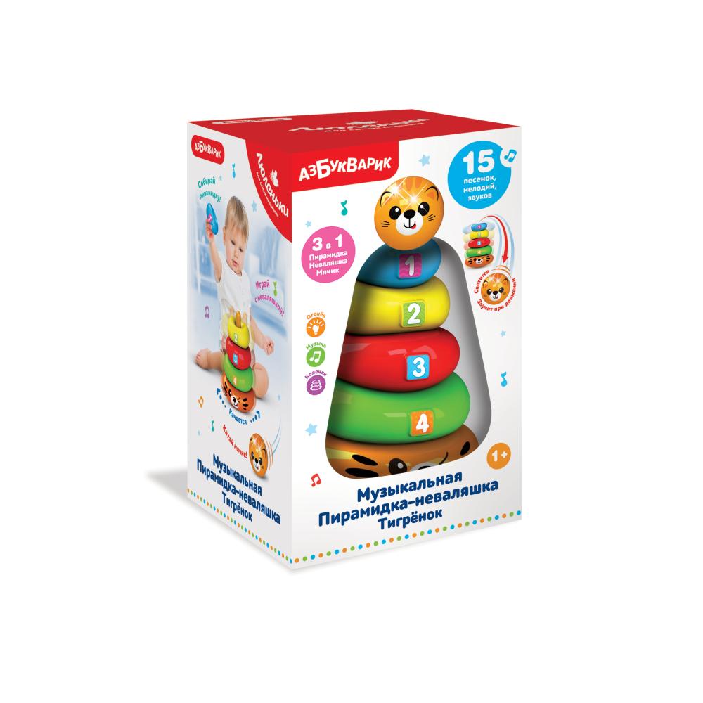 Музыкальная игрушка 3 в 1: пирамидка, неваляшка и мячик! Собери пирамидку из разноцветных колечек, а на вершину положи мячик в виде тигренка! Собрал пирамидку? Поиграй с ней, как с неваляшкой – она качается в разные стороны. Катай мячик – он звучит при движении! Слушай веселые песенки и мелодии («Много есть цветов прекрасных», «Прятки», «Песенка про счёт», «Чижик-пыжик», «Немецкая полька» и др.), забавные звуки. Огоньки на мячике мигают под музыку и дарят отличное настроение.