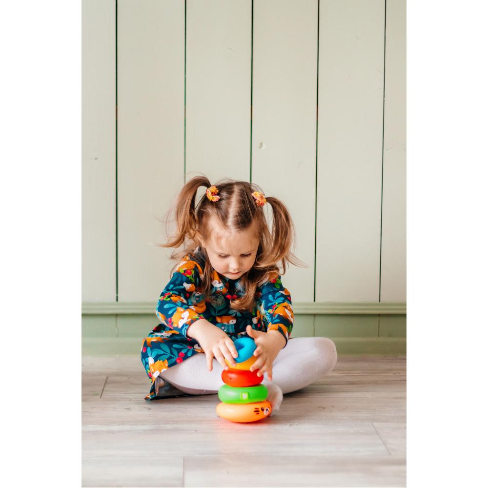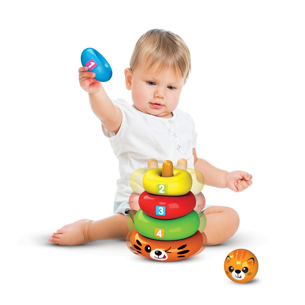 Игрушка отлично подходит для малышей от 1 года. Колечки разного цвета и размера развивают логическое мышление, песенки и звуки развивают слуховое восприятие, игры с мячиком и неваляшкой стимулируют двигательную активность и мелкую моторику.