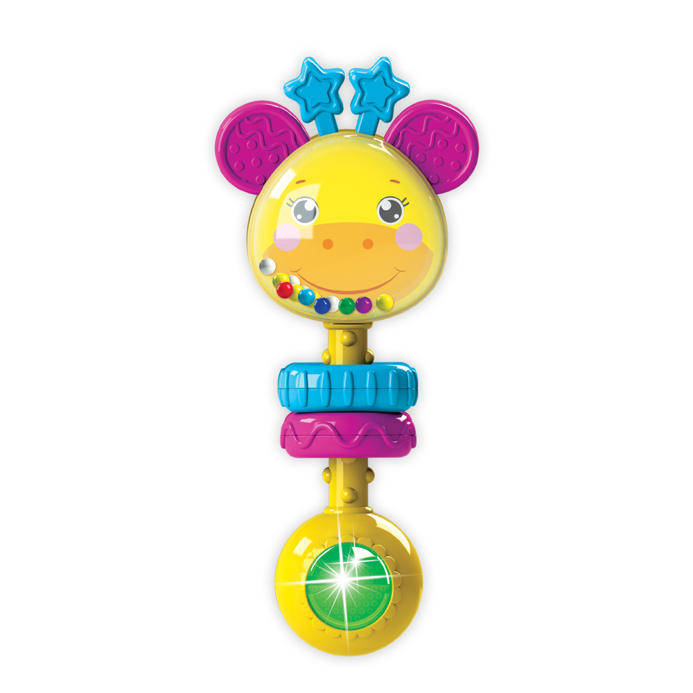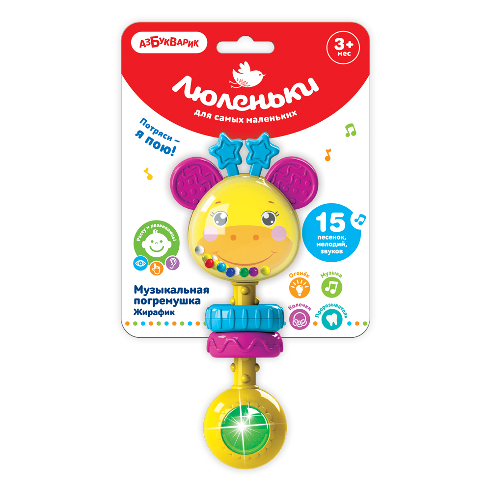 Музыкальная погремушка для малыша в виде симпатичного жирафика с мягкими ушками и рожками! Ребенку нужно просто потрясти погремушку – и жирафик споет песенку. Всего в игрушке 15 песенок, мелодий и звуков («Это кто у нас маленький такой?», «Как хорошо нам с мамочкой», «Чижик-пыжик», «Танец зверят» и др.), а также множество активных элементов. Яркий огонек привлекает внимание, цветные шарики весело звенят! А рельефные силиконовые ушки и пластмассовые колечки развивают тактильные ощущения – ребенку будет приятно потрогать их пальчиками.