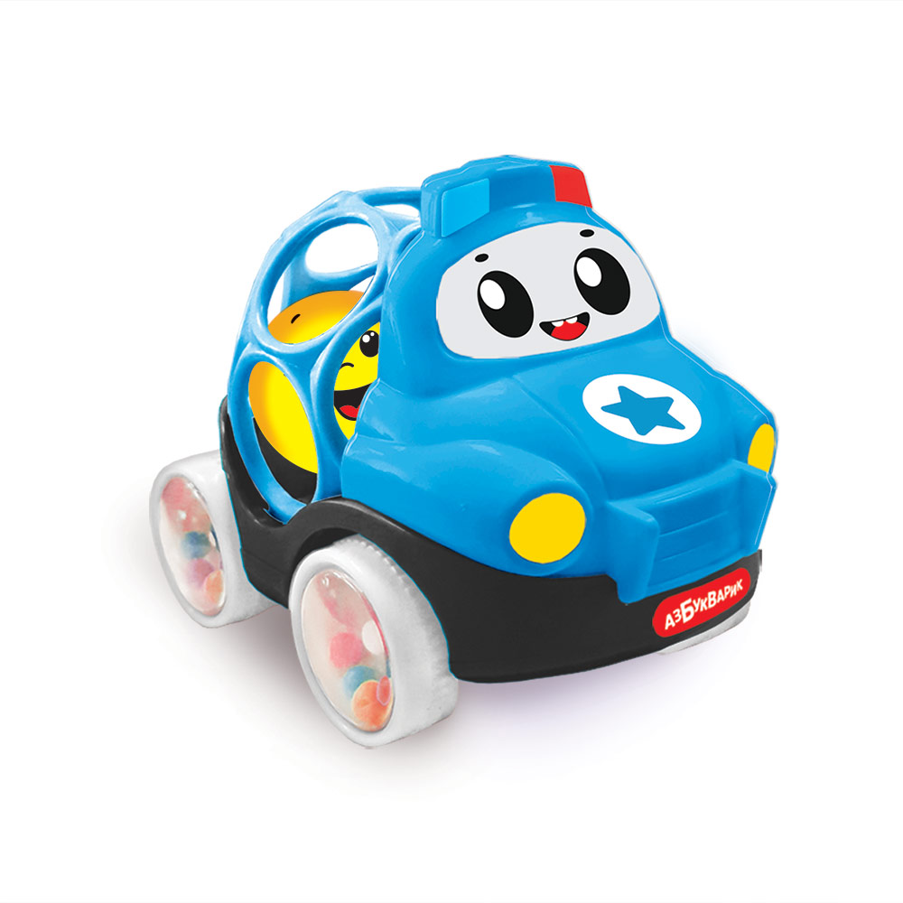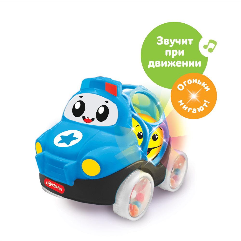 Чудо-машинка для самых маленьких – с мячиком в кузове! Она звучит при движении! Малыш будет катать полицейскую машинку – и слушать веселые песенки («Бибика», «Песенка про счет», «Гудят машины»), мелодии и звуки транспорта. Колесики звенят, как погремушка, огоньки мигают, а мягкий кузов так приятно потрогать пальчиками!