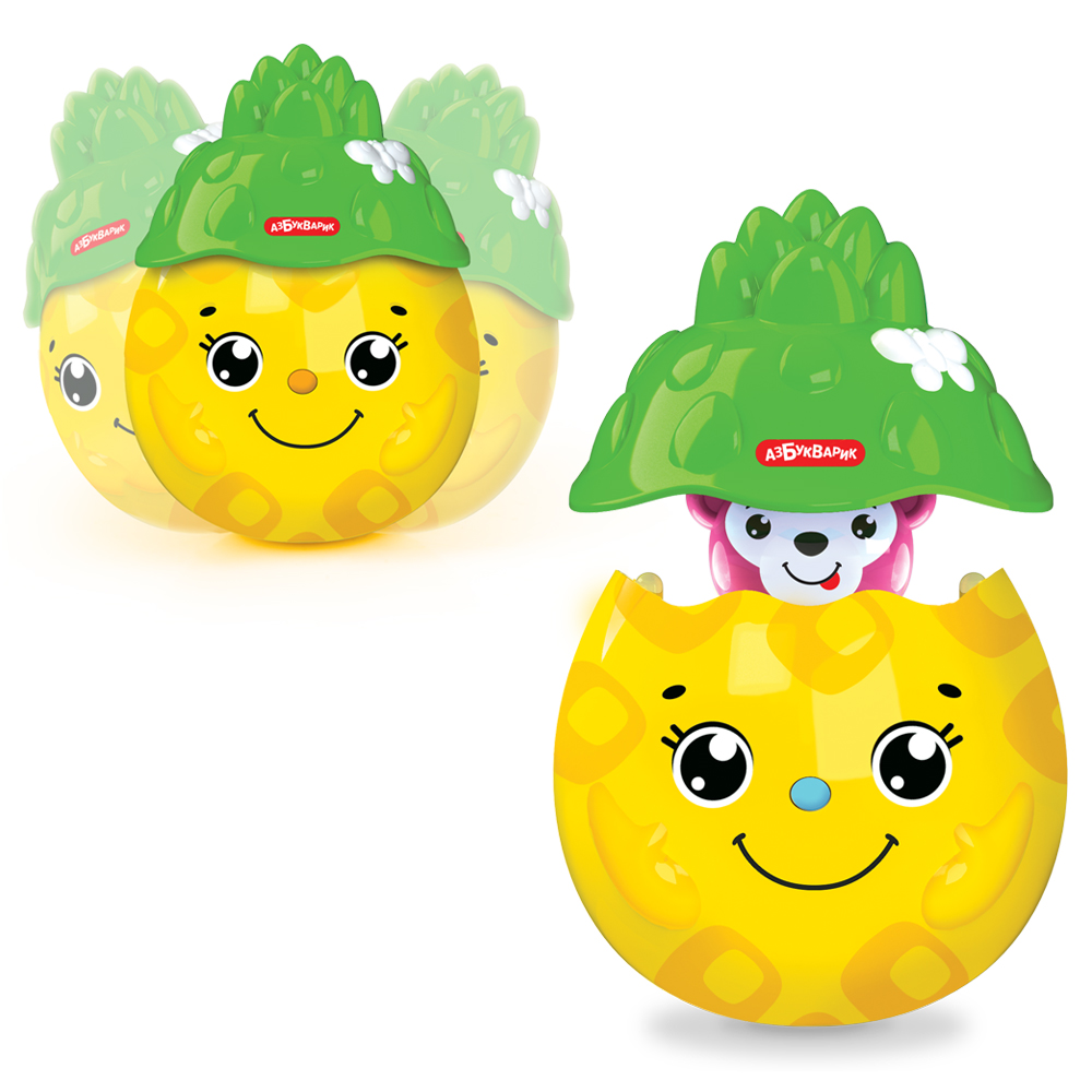 Игрушка-сюрприз порадует любого ребенка, особенно если этот сюрприз – музыкальный! Кто же прячется в большом ананасике? Нажми скорее на носик-кнопочку! Ух ты – это обезьянка! Продолжай нажимать на кнопочку – обезьянка споет 10 песенок и мелодий («Друзья», «Песенка про счёт», «Весёлые противоположности», «Пляшут весело детишки», «Бум Бум», «Весёлая карусель», «Песенка про кузнечика» и др.). Чтобы обезьянка обратно спряталась в домик-ананасик, нужно нажать на крышечку. А еще с ананасиком можно играть как с неваляшкой – раскачивать его в разные стороны!