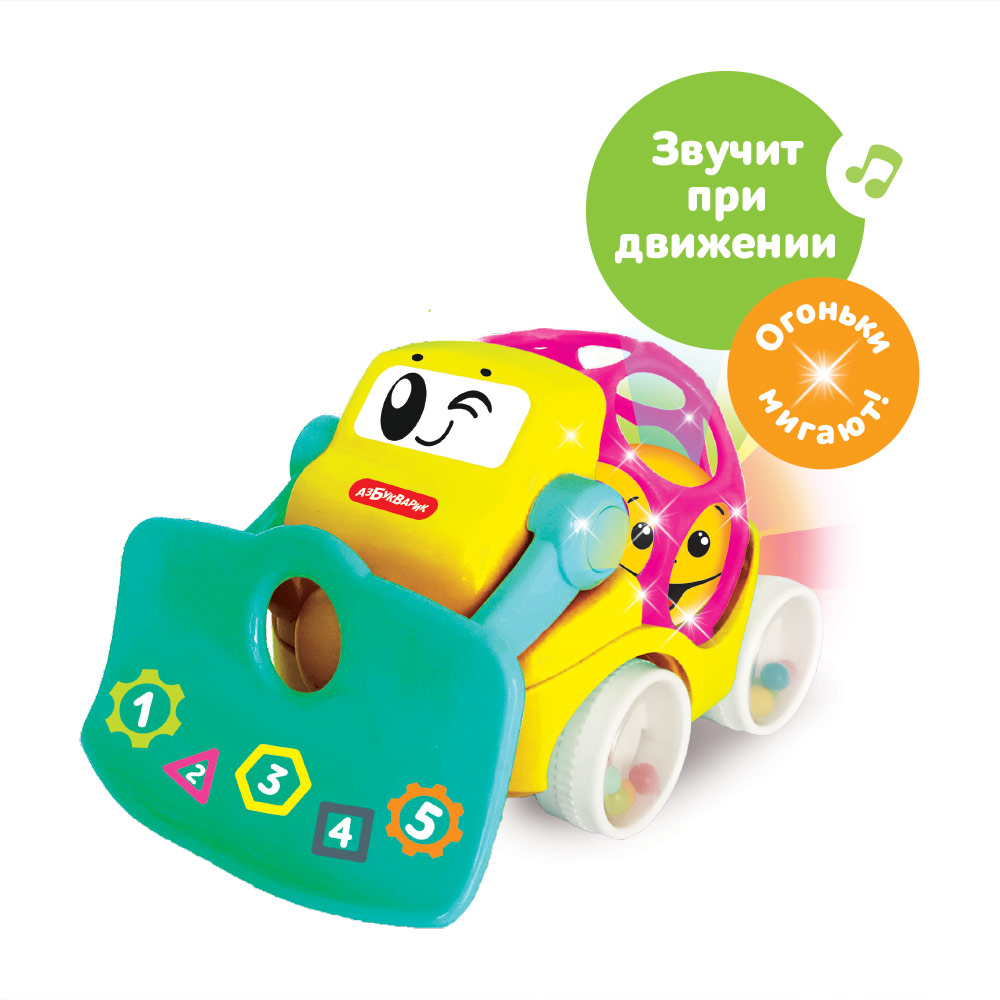 Чудо-машинка для самых маленьких – с мячиком в кузове! Она звучит при движении! Малыш будет катать бульдозер – и слушать веселые песенки («Бибика», «Песенка про счет», «Гудят машины»), мелодии и звуки транспорта. Колесики звенят, как погремушка, огоньки мигают, отвал поднимается и опускается, а мягкий кузов так приятно потрогать пальчиками!