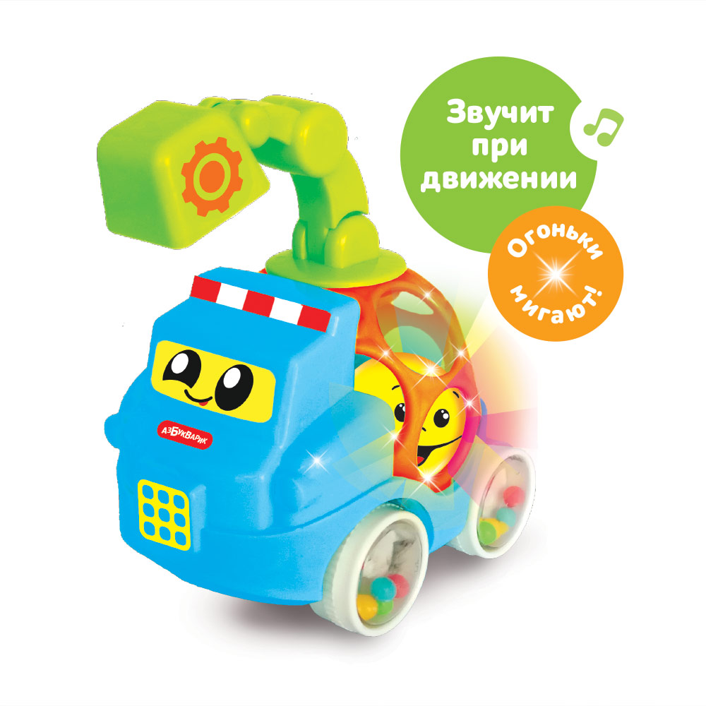 Чудо-машинка для самых маленьких – с мячиком в кузове! Она звучит при движении! Малыш будет катать экскаватор – и слушать веселые песенки («Бибика», «Песенка про счет», «Гудят машины»), мелодии и звуки транспорта. Колесики звенят, как погремушка, огоньки мигают, ковш двигается, а мягкий кузов так приятно потрогать пальчиками!