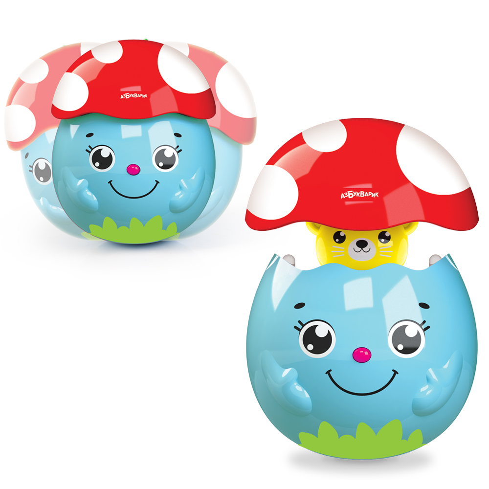 Игрушка-сюрприз порадует любого ребенка, особенно если этот сюрприз – музыкальный! Кто же прячется в большом грибочке? Нажми скорее на носик-кнопочку! Ух ты – это мышка! Продолжай нажимать на кнопочку – мышка споет 10 песенок и мелодий («Друзья», «Песенка про счёт», «Весёлые противоположности», «Пляшут весело детишки», «Бум Бум», «Весёлая карусель», «Песенка про кузнечика» и др.). Чтобы мышка обратно спряталась в домик-грибочек, нужно нажать на крышечку. А еще с грибочком можно играть, как с неваляшкой – раскачивать его в разные стороны!
