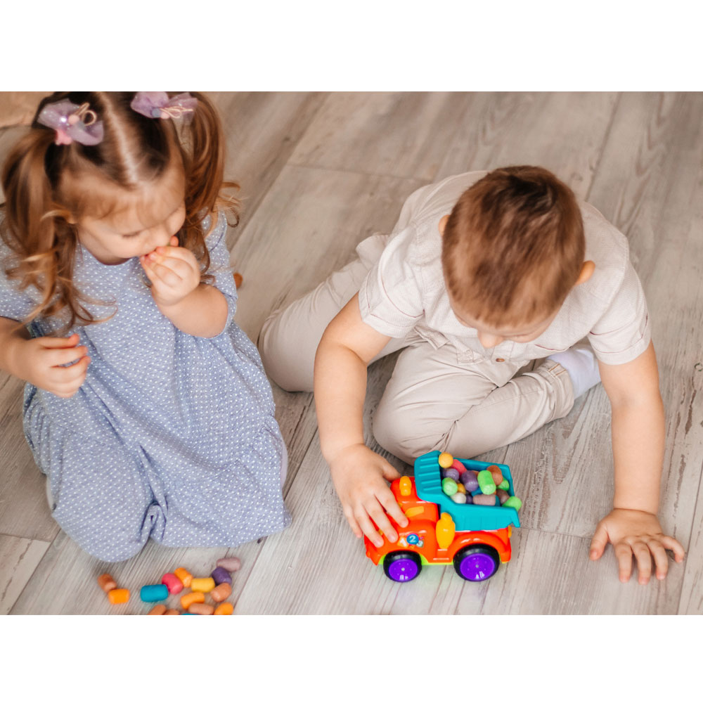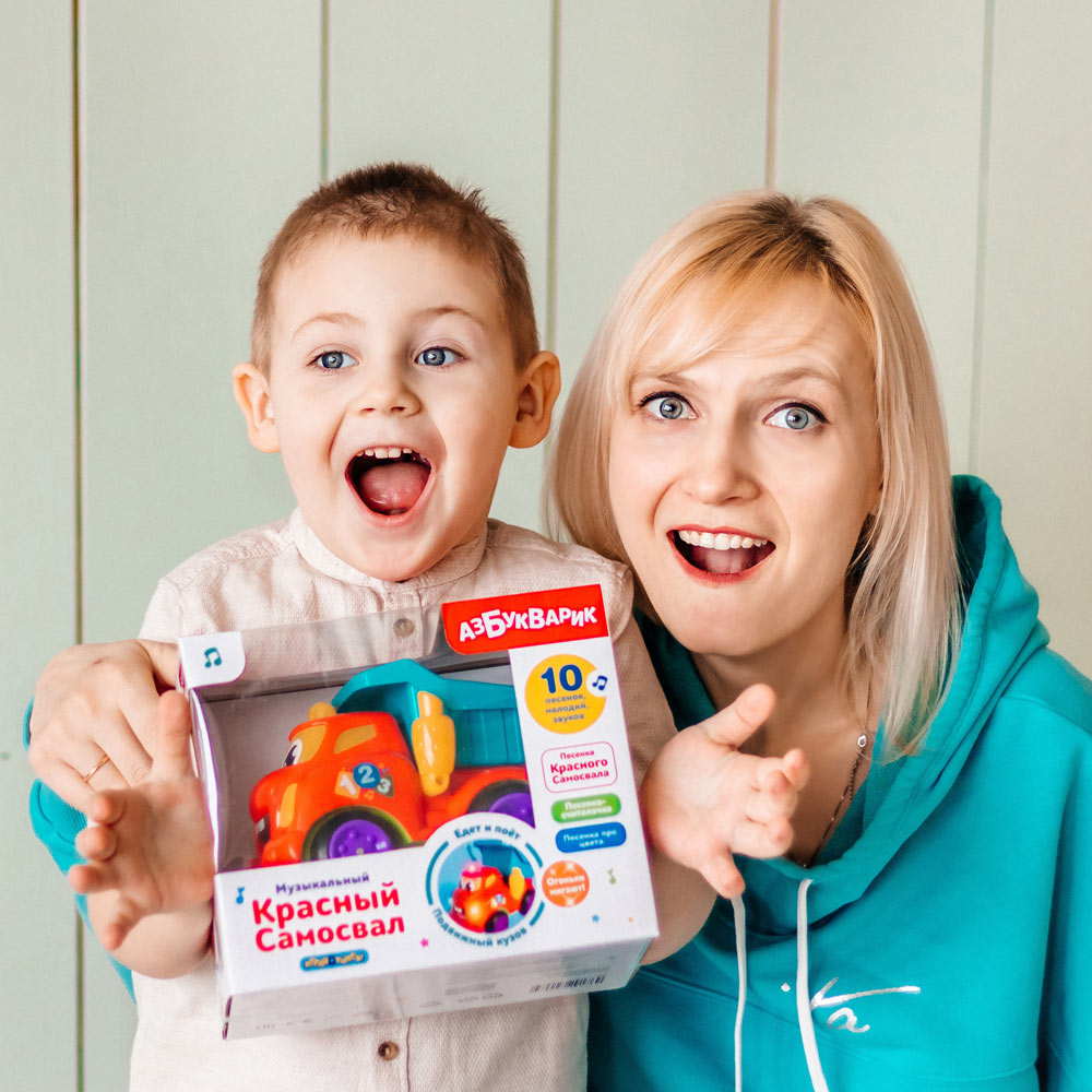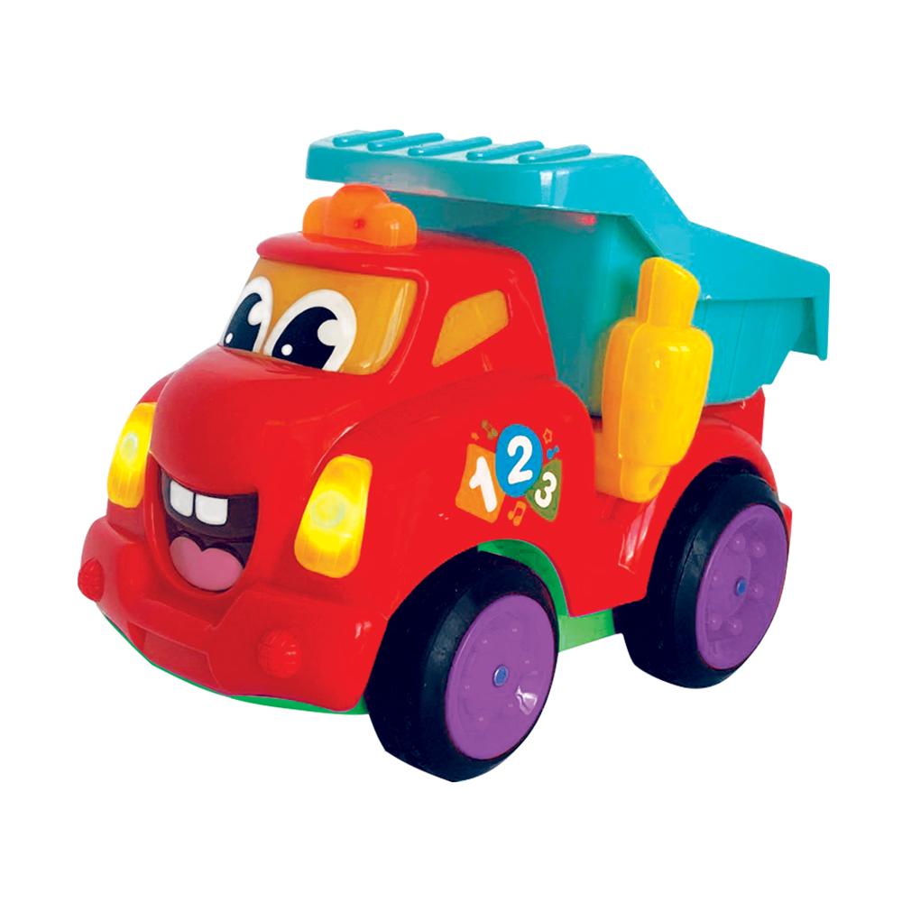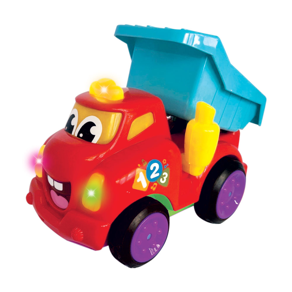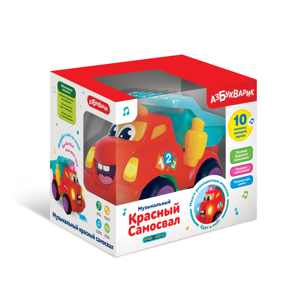 По дороге едет-едет Красный Самосвал! Полный кузов разных грузов он с собою взял! А что везет он и куда – решай сам. Загрузи эту большую машинку, включи ее – и вперед! Красный Самосвал едет сам, объезжает препятствия, его кузов поднимается и опускается, фары светятся! И самое главное – Самосвал едет под музыку и сам поет 3 веселые и познавательные песенки («Песенка Красного самосвала», «Песенка-считалочка», «Песенка про цвета»). Благодаря этим песням малыш легко сможет выучить счет и цвета. Сколько раз просигналила машинка? Би-би-би – раз-два-три! А детали самосвала – разноцветные: красная кабина, голубой кузов, фиолетовые колеса. Играй и учись!