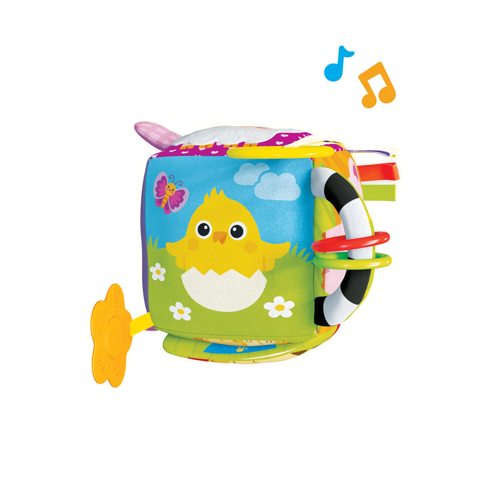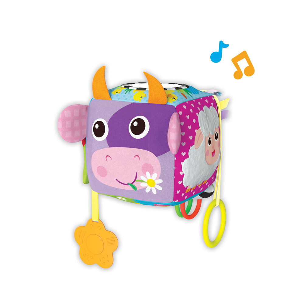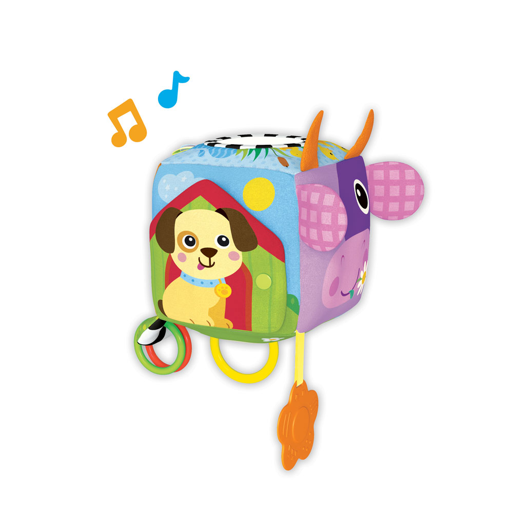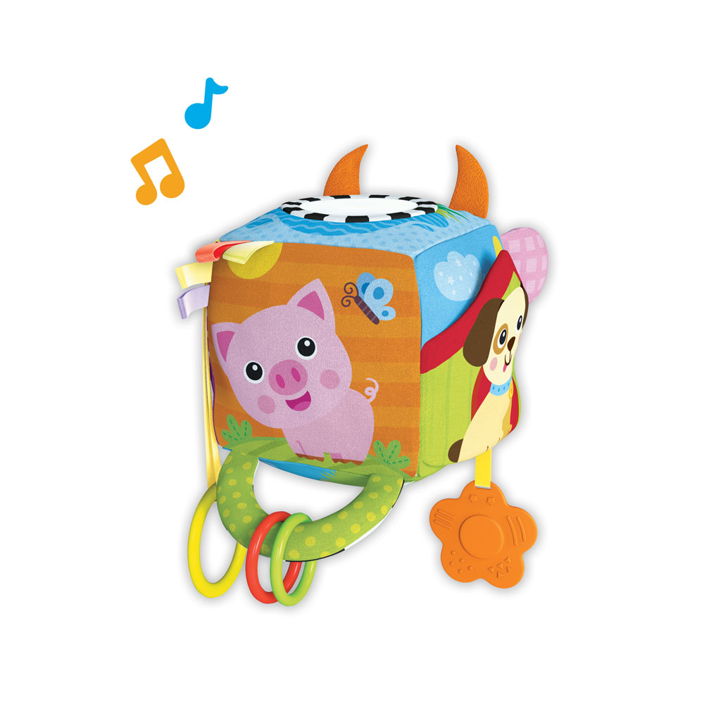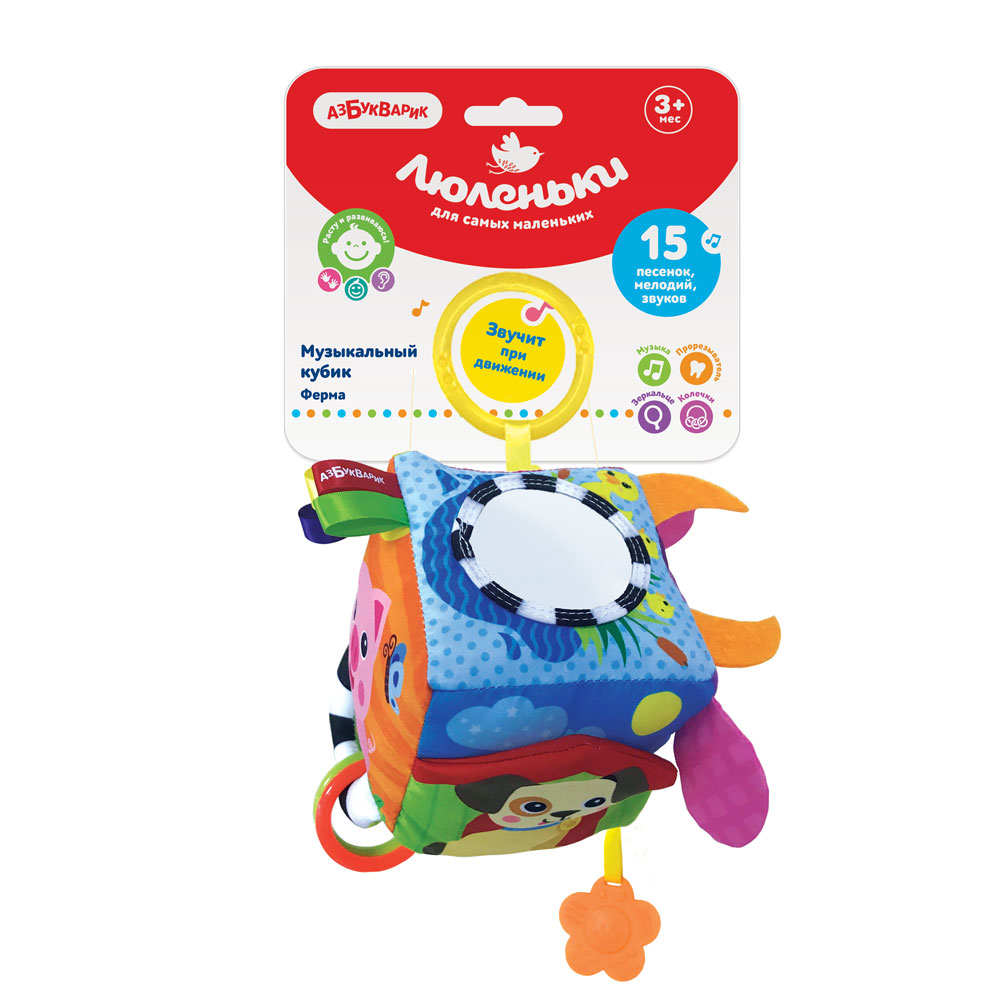 Мягкий музыкальный кубик – отличная развивающая игрушка для малышей первого года жизни. Он мягкий и легкий, изготовлен из приятного на ощупь текстильного материала. Кубик звучит при движении – играя с ним, малыш сможет послушать песенку про ферму и еще 15 звуков и мелодий («Песенка про кузнечика», «Чижик-пыжик» и т.д.) На каждой стороне кубика изображена зверюшка фермы с «сюрпризом». Разные фактуры ткани, вшитые ленточки, колечки развивают тактильные ощущения. Шуршалки и безопасное зеркальце привлекают внимание, а прорезыватель помогает зубкам расти. Благодаря удобной подвеске кубик легко прикрепить к коляске и кроватке.