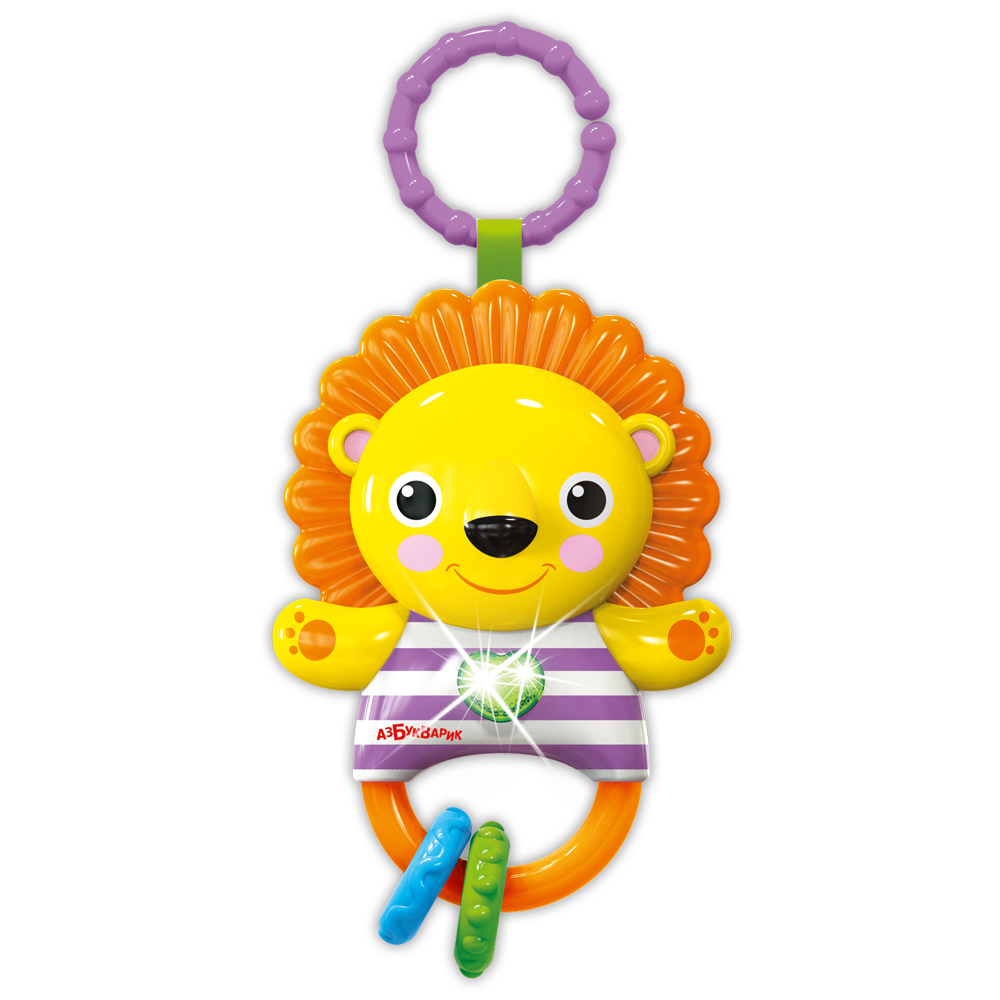 Яркая музыкальная подвеска для малыша в виде модного львенка! При нажатии на кнопочку ребенок сможет послушать веселые звуки, 5 песенок и мелодий(«Раз-два-три», «Тра-ля-ля», «Танец зверят» и др.). В игрушке много активных элементов, помогающих в развитии органов чувств. Грива львенка крутится и издает забавный звук трещотки, рельефные колечки развивают мелкую моторику,кнопочка с огоньком привлекает внимание. Подвеска удобно крепится на кроватку или коляску с помощью колечка.