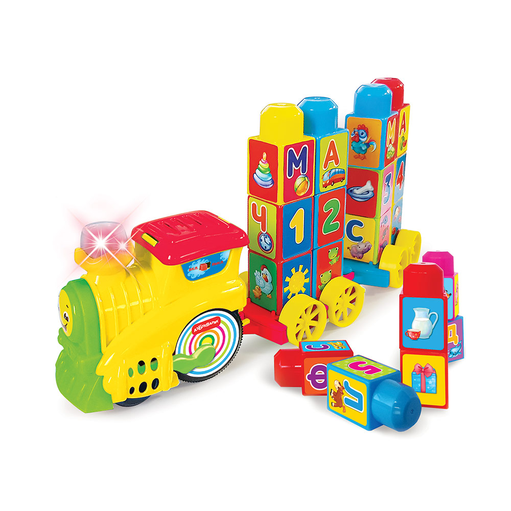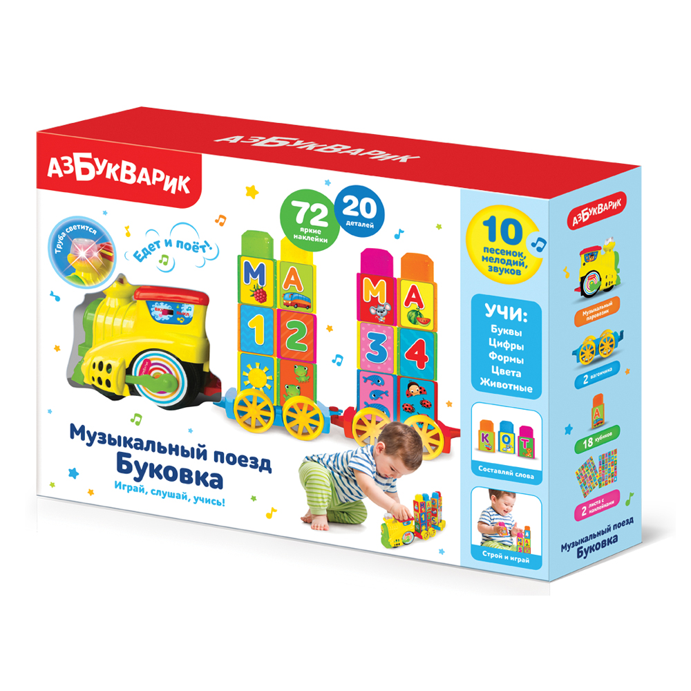 Музыкальный поезд Буковка – это уникальная развивающая игрушка «2 в 1»: музыкальный паровозик и обучающий конструктор. Включи паровозик – он поедет сам и будет петь песенки и издавать настоящие звуки паровоза! Цепляй вагончики – паровозик легко повезет их за собой! Хочешь покатать зверят? Посади их в вагончики – прикрепи нужные кубики. Строй из кубиков башни, фигуры, учи буквы, цифры, формы, цвета и животных. Составляй из букв слоги и слова, подбирай логические пары – с этим поездом-конструктором можно придумать более 10 обучающих игр! Каждый раз можно играть по-новому!