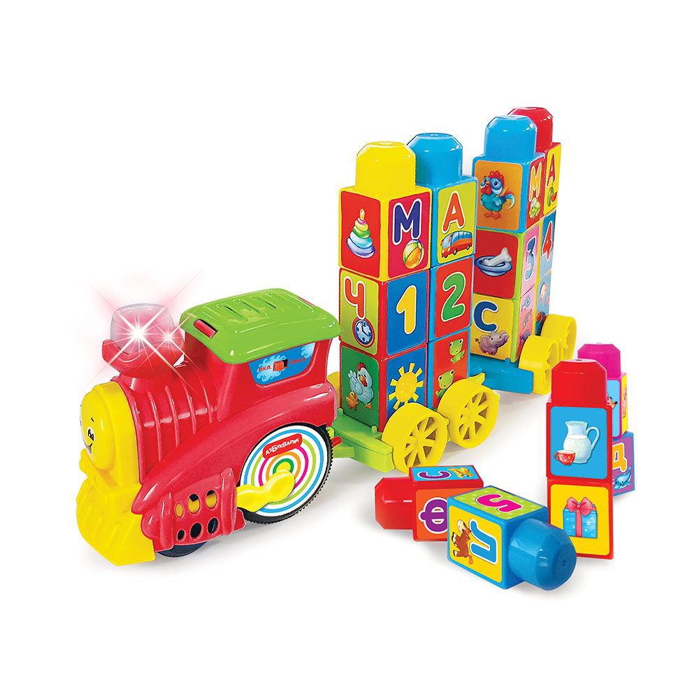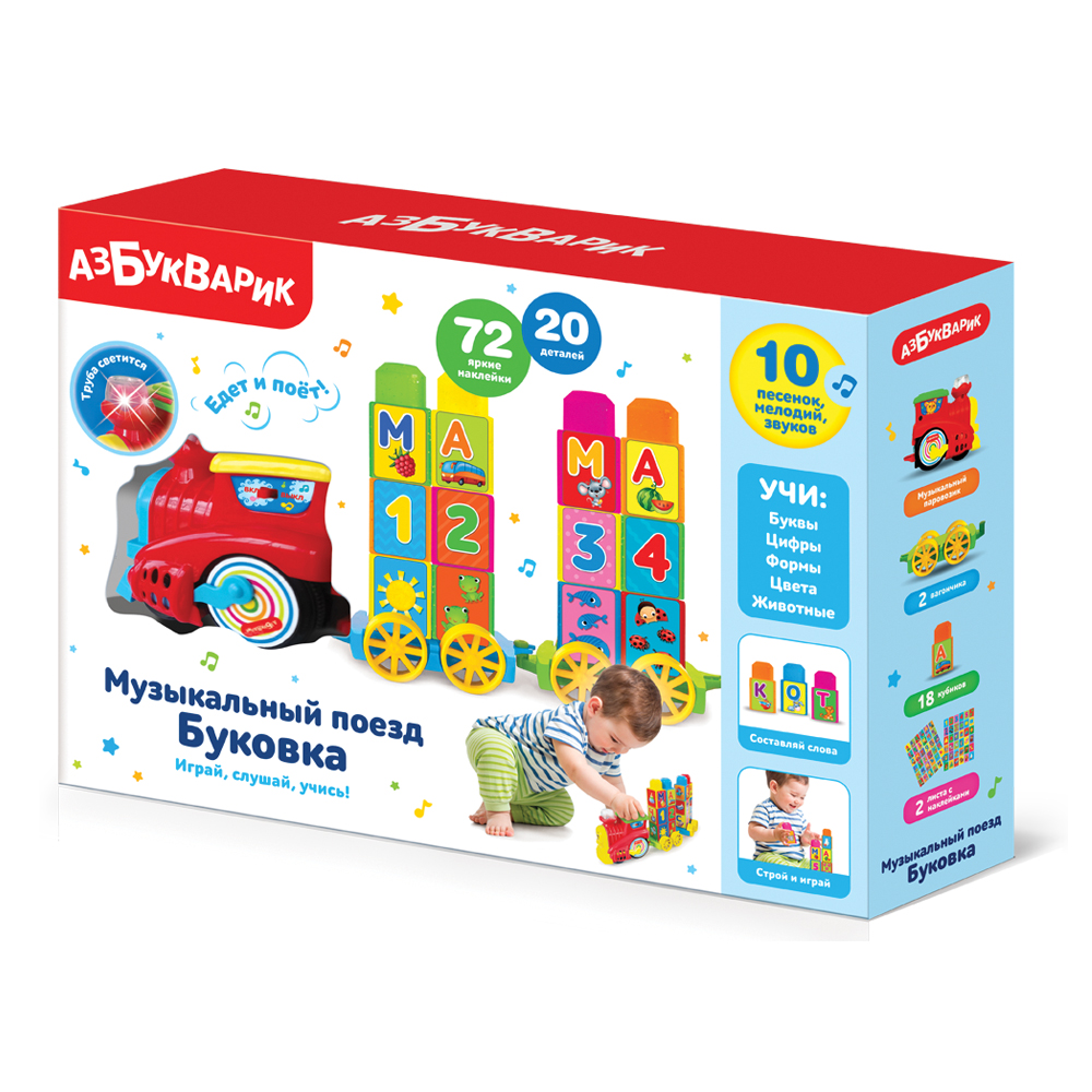 Музыкальный поезд Буковка – это уникальная развивающая игрушка «2 в 1»: музыкальный паровозик и обучающий конструктор. Включи паровозик – он поедет сам и будет петь песенки и издавать настоящие звуки паровоза! Цепляй вагончики – паровозик легко повезет их за собой! Хочешь покатать зверят? Посади их в вагончики – прикрепи нужные кубики. Строй из кубиков башни, фигуры, учи буквы, цифры, формы, цвета и животных. Составляй из букв слоги и слова, подбирай логические пары – с этим поездом-конструктором можно придумать более 10 обучающих игр! Каждый раз можно играть по-новому!