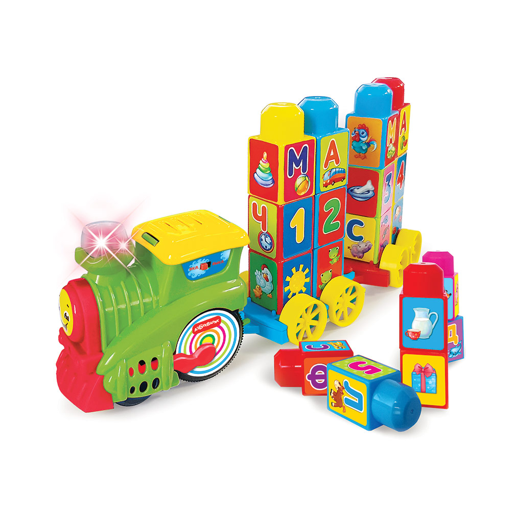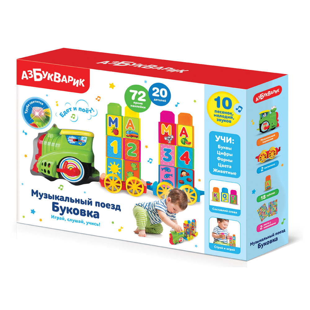 Музыкальный поезд Буковка – это уникальная развивающая игрушка «2 в 1»: музыкальный паровозик и обучающий конструктор. Включи паровозик – он поедет сам и будет петь песенки и издавать настоящие звуки паровоза! Цепляй вагончики – паровозик легко повезет их за собой! Хочешь покатать зверят? Посади их в вагончики – прикрепи нужные кубики. Строй из кубиков башни, фигуры, учи буквы, цифры, формы, цвета и животных. Составляй из букв слоги и слова, подбирай логические пары – с этим поездом-конструктором можно придумать более 10 обучающих игр! Каждый раз можно играть по-новому!
