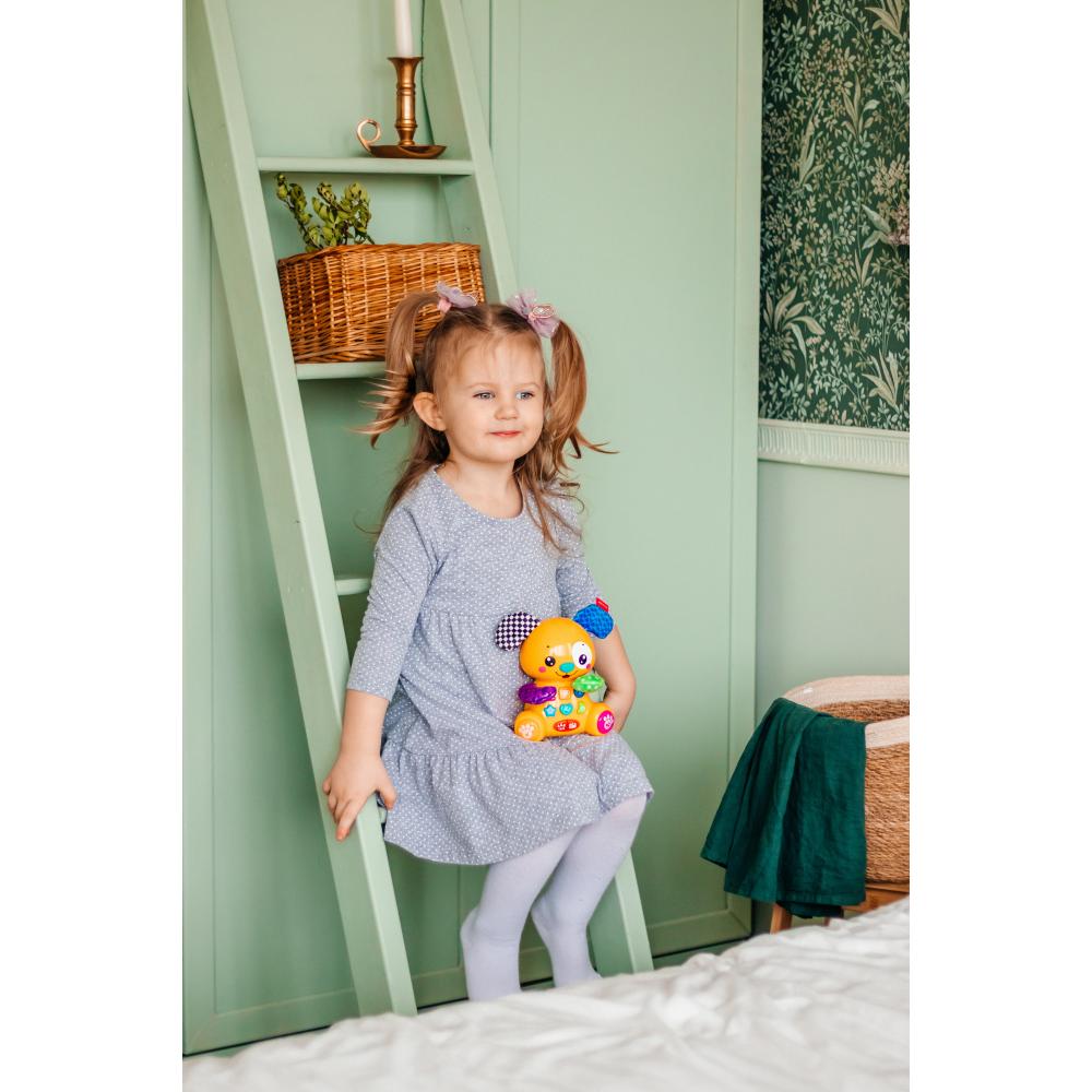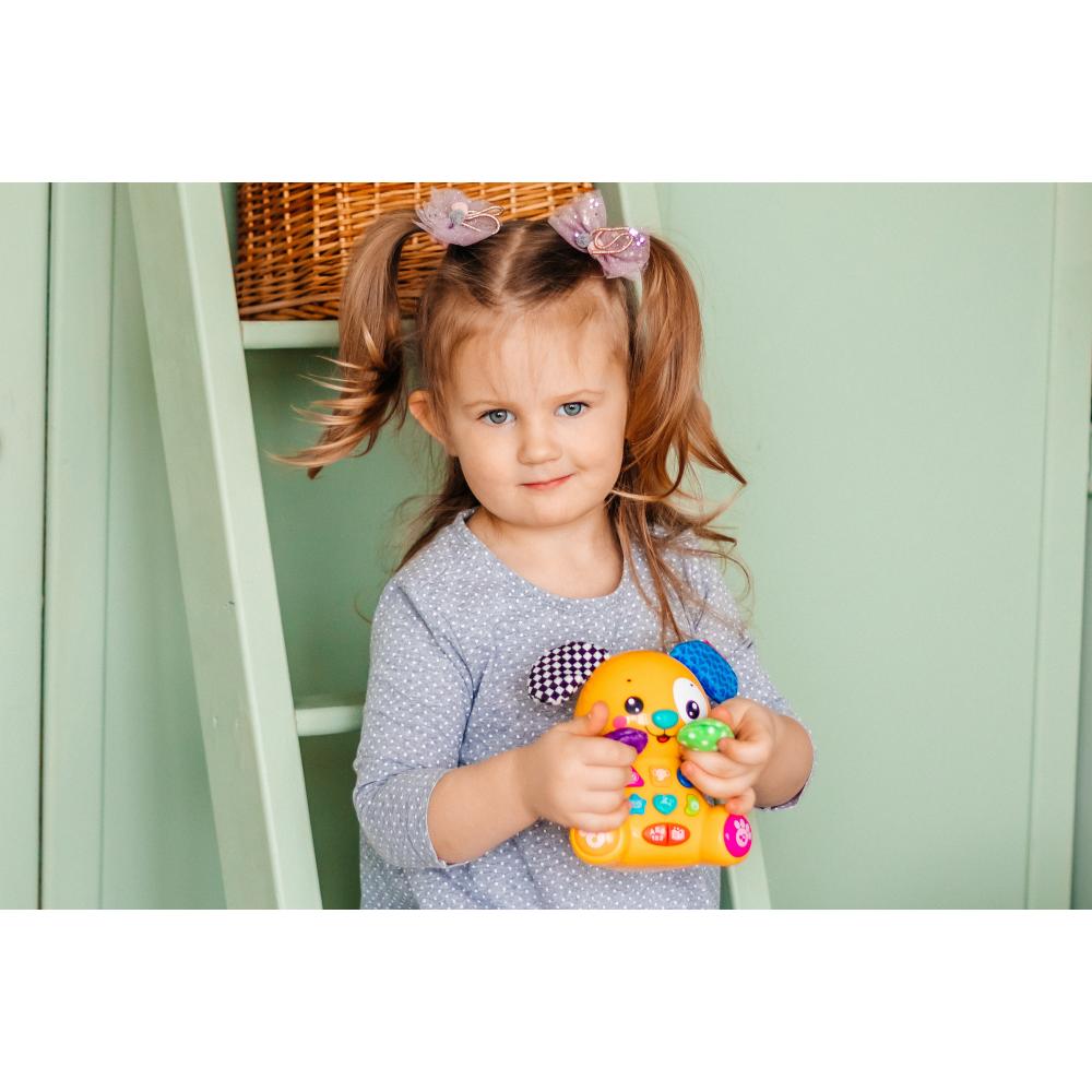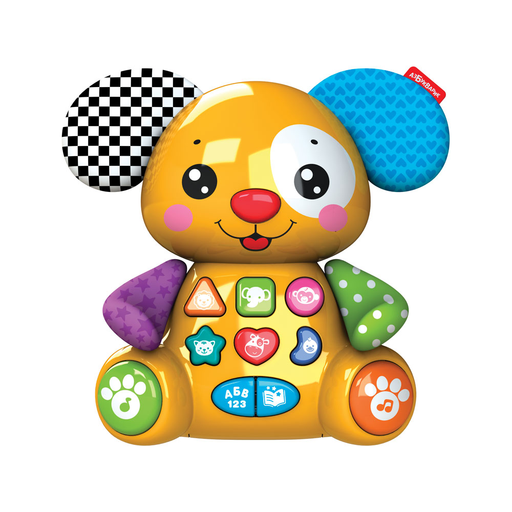 Щенок будет реагировать на каждое действие малыша, как живой! Погладь ему носик – слушай веселые звуки и мелодию. Нажимай на кнопочки – слушай 25 песенок и мелодий («Песенка про алфавит», «Песенка про счёт», «Песенка про формы», «Песенка про цвета», «Весёлые противоположности», «Лев», «Чунга-чанга», «Слон» , «Бум-Бум», «Мартышка», «Что такое праздник?» и др.), а также 4 сказки («Гав-гав», «Песенка Мышонка», «Хвосты», «Солнышко»). Подними лапки – щенок захочет поиграть в прятки и скажет «Ку-ку!». А если потрогать задние лапки – он засмеется от щекотки!