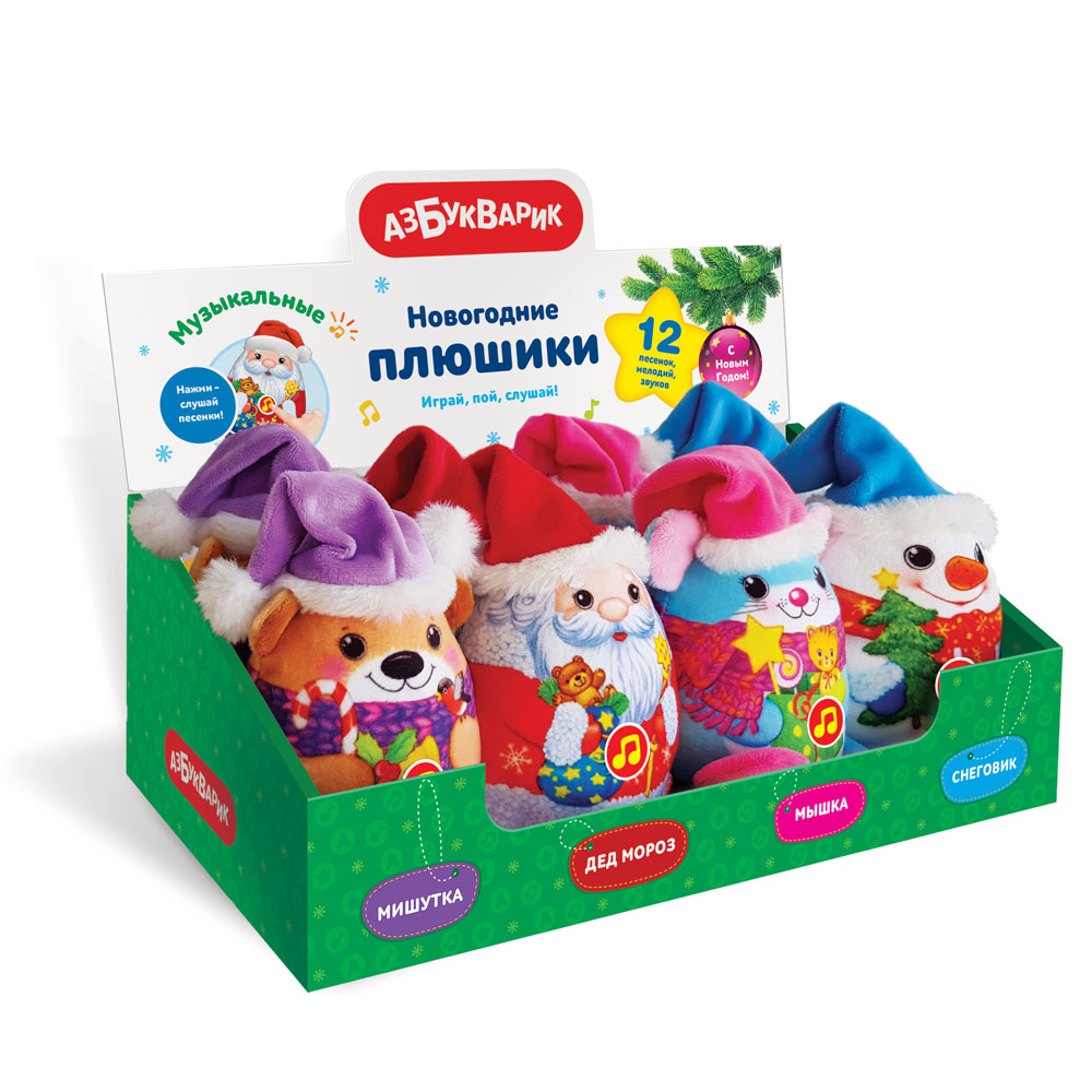 Плюшевые друзья поздравляют малышей с любимыми праздниками – Новым годом и Рождеством! Нужно только нажать на нотку – и игрушки оживут! Они сами поют популярные новогодние песенки («В лесу родилась ёлочка», «Рождественская песенка», «Дед Мороз»), играют мелодии («We Wish You A Merry Christmas», «Валенки», «Добрый жук»). Собери всю компанию вместе – Снеговичка, Деда Мороза, Мишутку и Мышку.