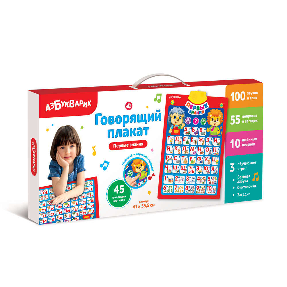 Хотите, чтобы ваш ребёнок легко выучил буквы и освоил счёт до 10? Интерактивный говорящий плакат «Первые знания» – отличный выбор! Большие буквы, яркие картинки, загадки, обучающие песенки про алфавит, цифры, времена года, противоположности и цвета, умные игры («Считалочка» и «Весёлая азбука», "Отгадай загадки") – всё это сделает обучение весёлым и интересным! Плакат можно повесить на стену или играть с ним на столе.
