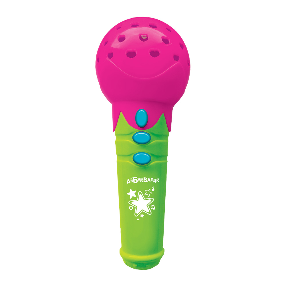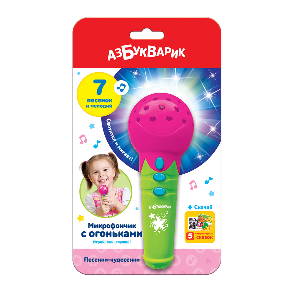 Яркий микрофончик порадует малышей любимыми песенками и веселыми огоньками! Нажимай на кнопочки – слушай детские хиты («Чунга-чанга», «Четыре таракана и сверчок»), забавные потешки («Дождик», «Щенок», «Лошадка»), зажигательные мелодии («Калинка», «Частушки»). Подпевай и танцуй, а микрофончик будет светиться под музыку!