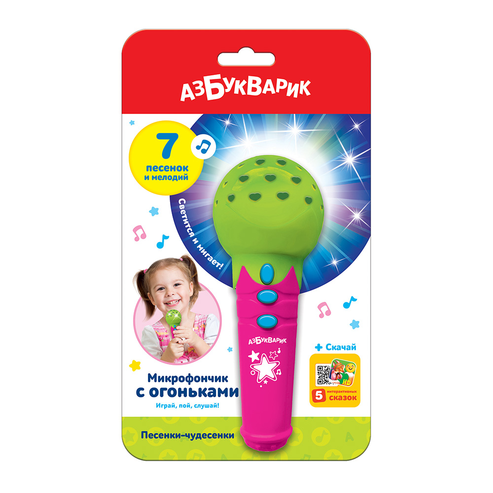 Яркий микрофончик порадует малышей любимыми песенками и веселыми огоньками! Нажимай на кнопочки – слушай детские хиты («Чунга-чанга», «Четыре таракана и сверчок»), забавные потешки («Дождик», «Щенок», «Лошадка»), зажигательные мелодии («Калинка», «Частушки»). Подпевай и танцуй, а микрофончик будет светиться под музыку!