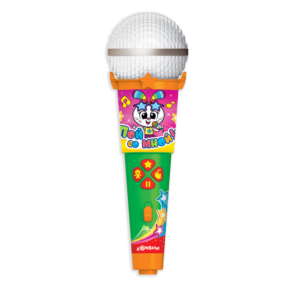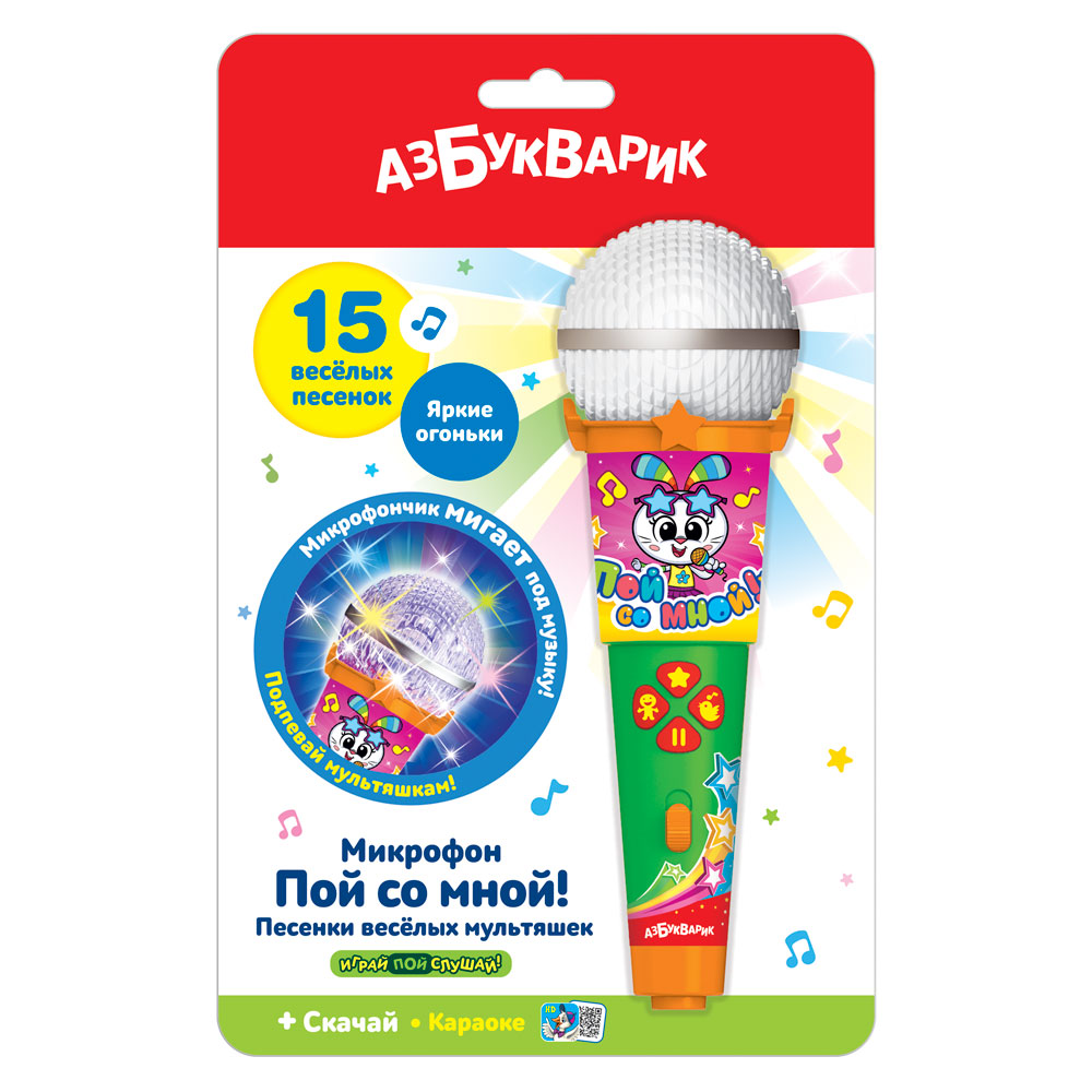 Каждый ребёнок может стать звездой! Весёлое пение с этим чудо-микрофоном раскроет музыкальные и актёрские таланты малыша! Главный сюрприз – микрофон светится под музыку, как настоящий диско-шар. Слушай и пой 15 хитов из любимых мультфильмов («Фантики», «У друзей нет выходных» (Барбарики), «Ничего на свете лучше нету», «Добрый жук» и др.).