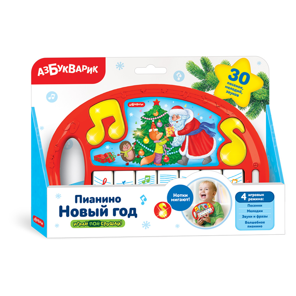 Новогоднее пианино для самых маленьких со светящимися нотками и 4 режимами игры.