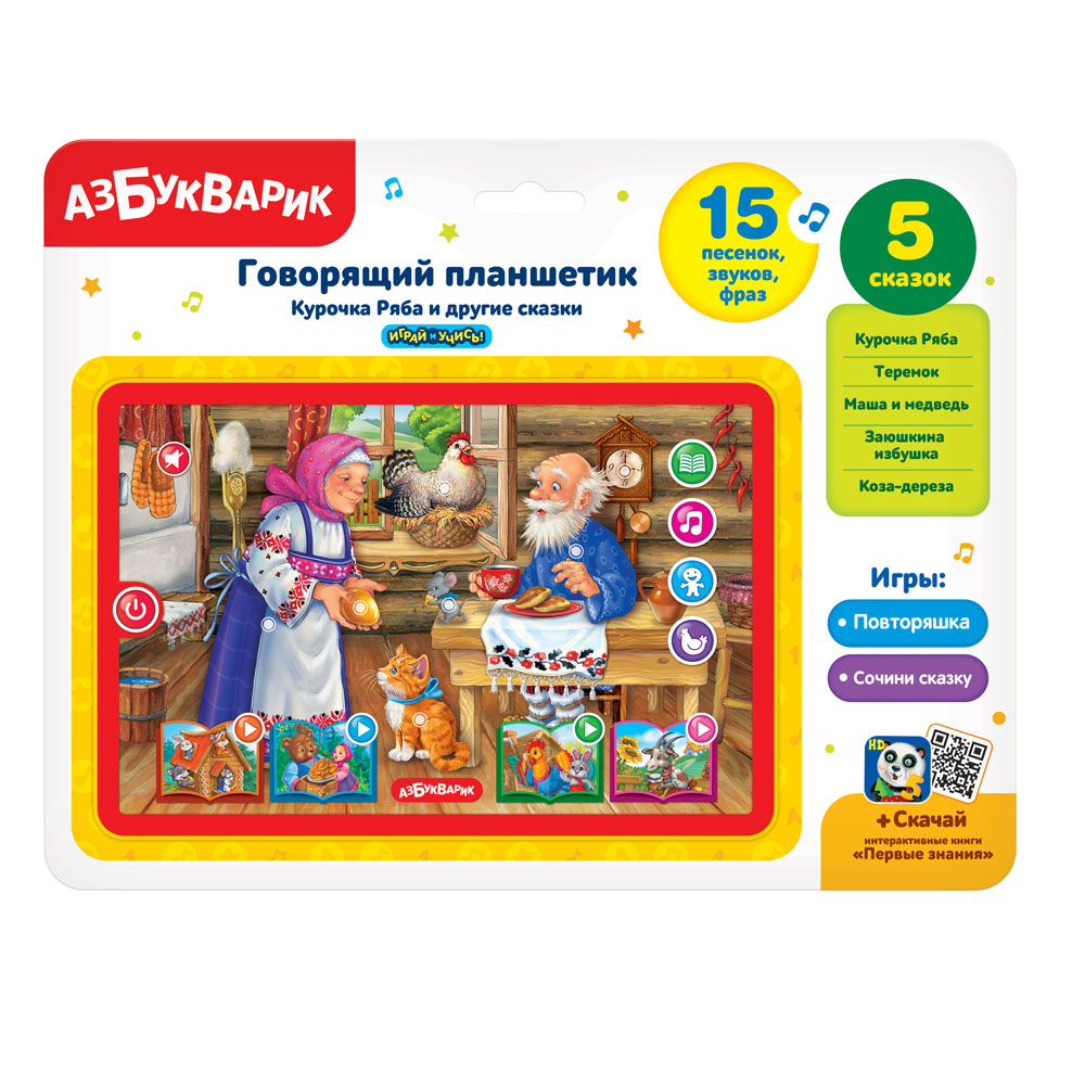 В этом говорящем планшетике с яркой сюжетной картинкой собрано 5 сказок («Курочка Ряба», «Теремок», «Маша и медведь», «Заюшкина избушка», «Коза-дереза») и лучшие народные потешки. Интерактивные игры («Повторяшка» и «Сочини сказку») не только развлекают, но и развивают память, воображение, фантазию. Нажимай на кнопочки – слушай сказки и потешки, играй со сказочными персонажами!