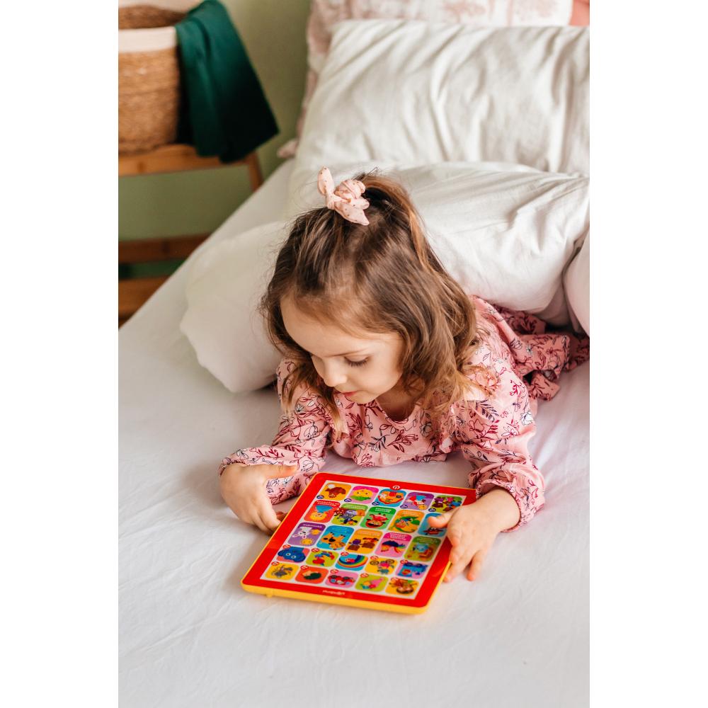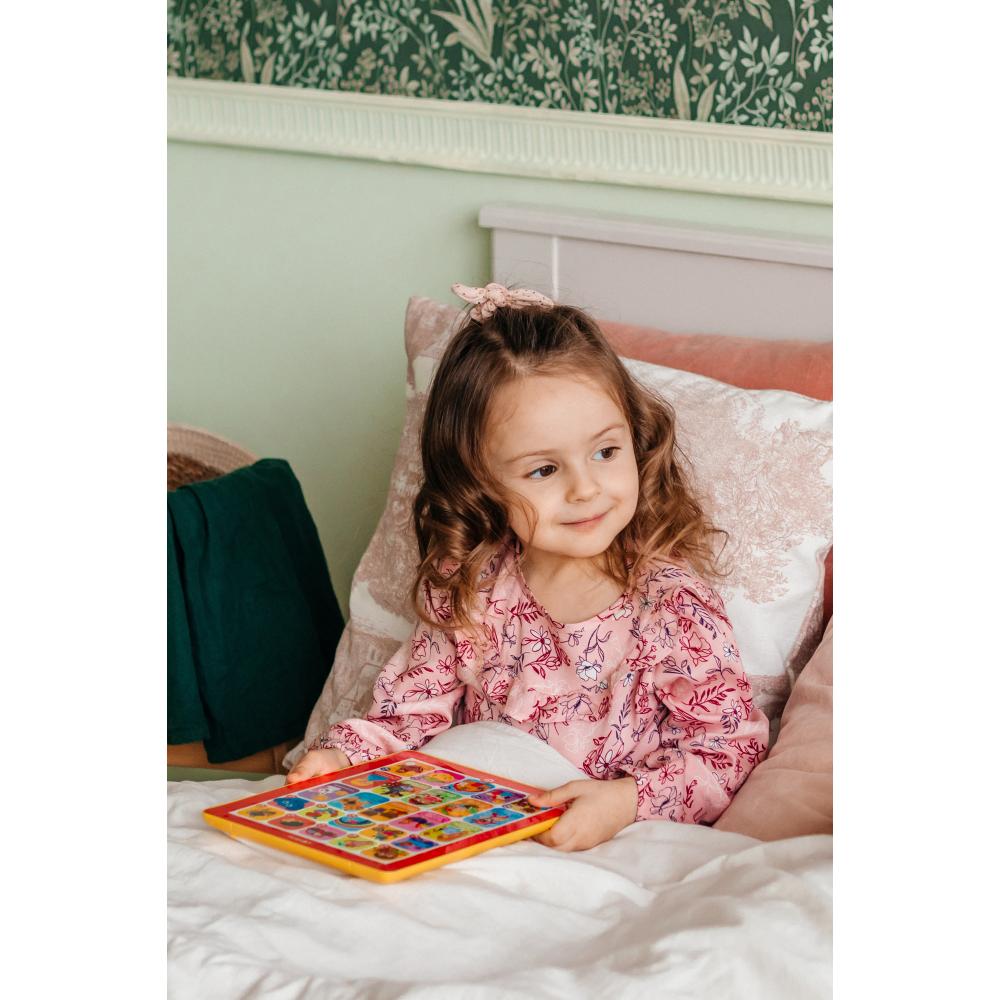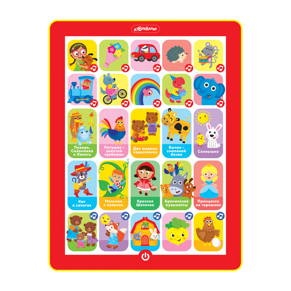 С новым говорящим и музыкальным планшетиком скучать не придётся! Ведь в нём есть и любимые народные сказки («Пузырь, Соломинка и Лапоть», «Петушок – золотой гребешок», «Два жадных медвежонка», «Бычок – смоляной бочок», «Солнышко»), и сказки известных писателей («Кот в сапогах», «Мальчик с пальчик», «Красная Шапочка», «Бременские музыканты», «Принцесса на горошине»), и весёлые детские хиты («Барбарики», «Мамочка», «Бибика», «Бум-Бум», «Чуку-чу» и др.), и даже сказки-песенки («Три медведя», «Колобок», «Теремок», «Репка», «Курочка Ряба»). Всего в планшетике 25 песенок, сказок, стихов, а также множество веселых звуков и голосов зверят. Все картинки звучат!