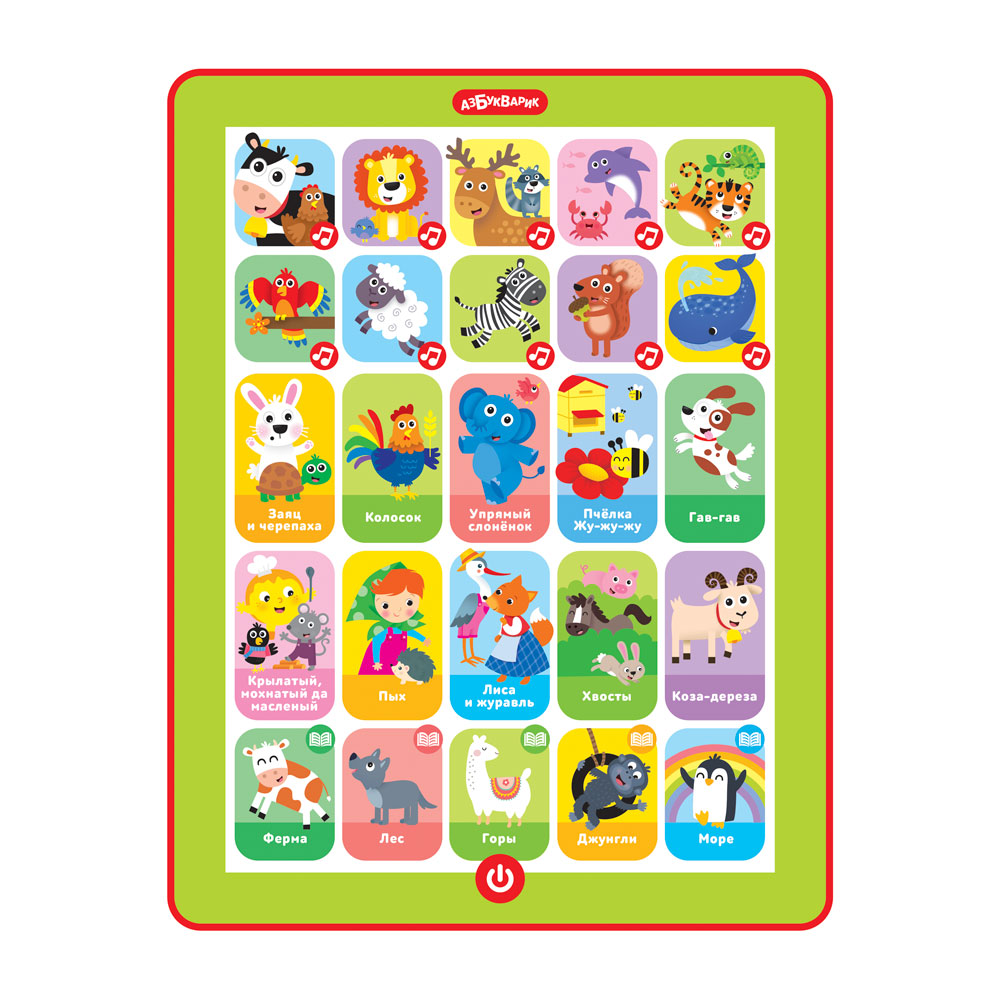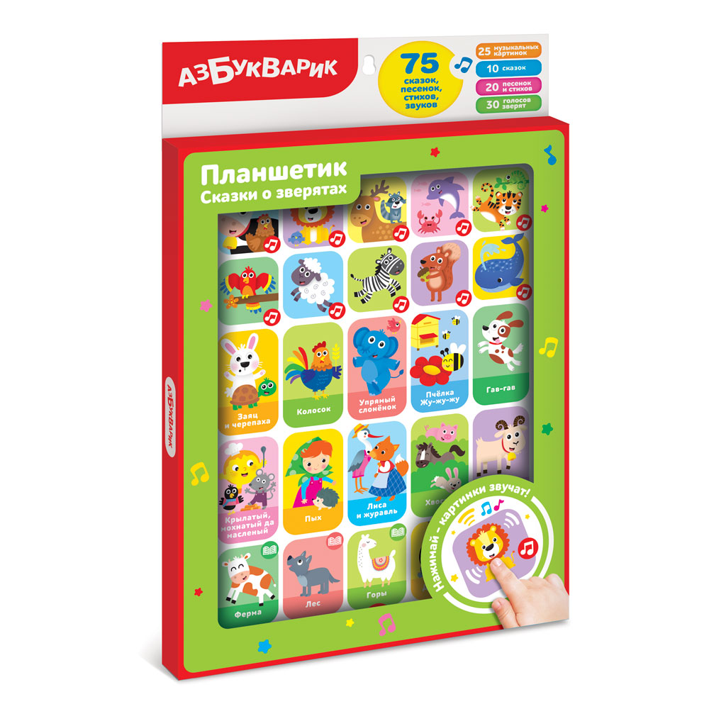В этом планшетике собрано всё о зверятах: и весёлые песенки («Африка», «Лесные соседи», «Море, море, море!», «Джунгли» и др.), и сказки о животных («Заяц и черепаха», «Колосок», «Упрямый слонёнок», «Гав-гав», «Хвосты» и др.), и познавательные стихотворения («Телёнок», «Не ходите далеко», «Волк», «Мишка-трусишка» и др.). Сказочные истории о зверятах так интересно слушать, а песенки или стихи легко выучить наизусть. Всего в планшетике 30 песенок, сказок, стихов, а еще множество звуков и голосов зверят. Все картинки звучат!