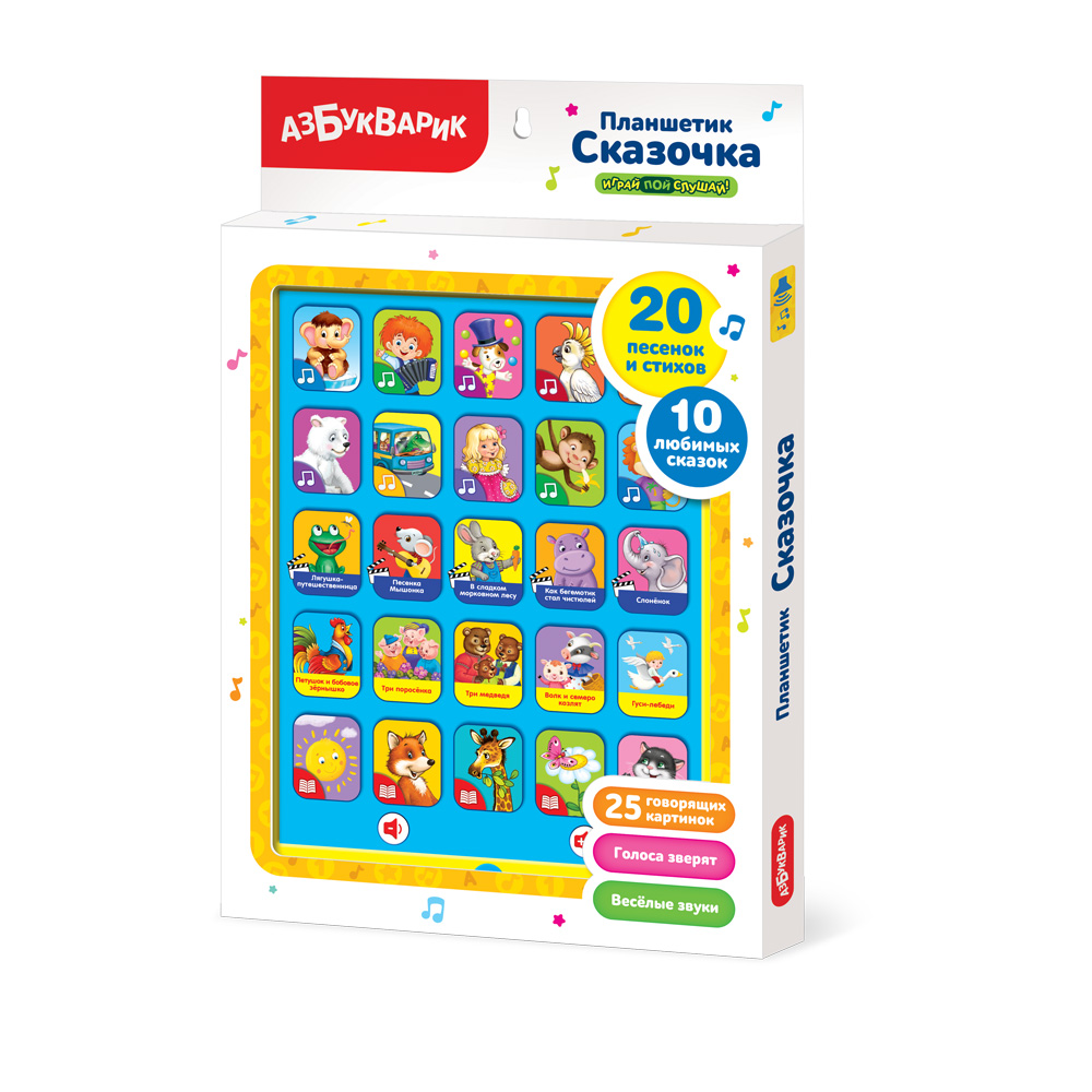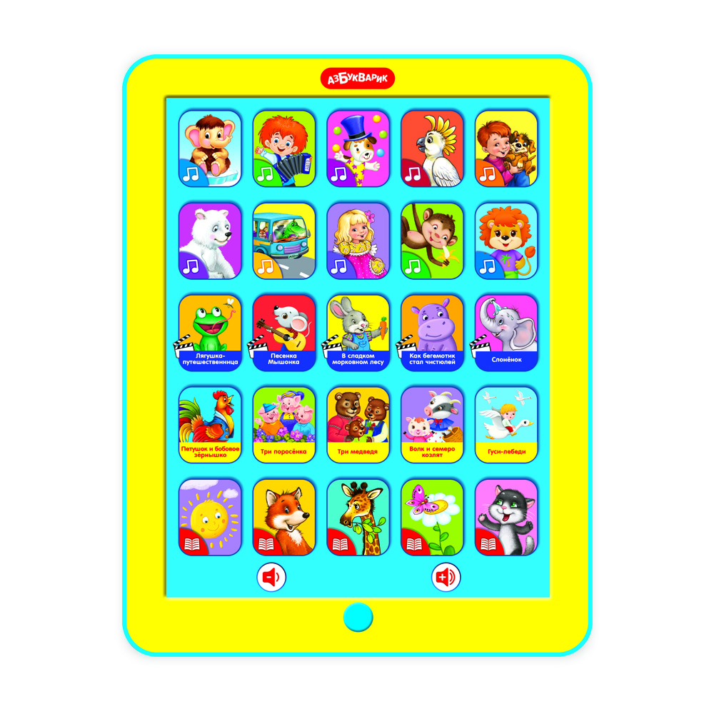 Этот планшетик надолго займёт внимание малыша! Ведь в нём есть 30 песенок, стихов и сказок. Здесь и добрые мультики, и весёлые песенки, и любимые сказки, и забавные стишки. Малыш сможет спеть с Антошкой и Мамонтёнком, послушать сказки про трех медведей, трех поросят, волка и семеро козлят, выучить стихи про зверят.