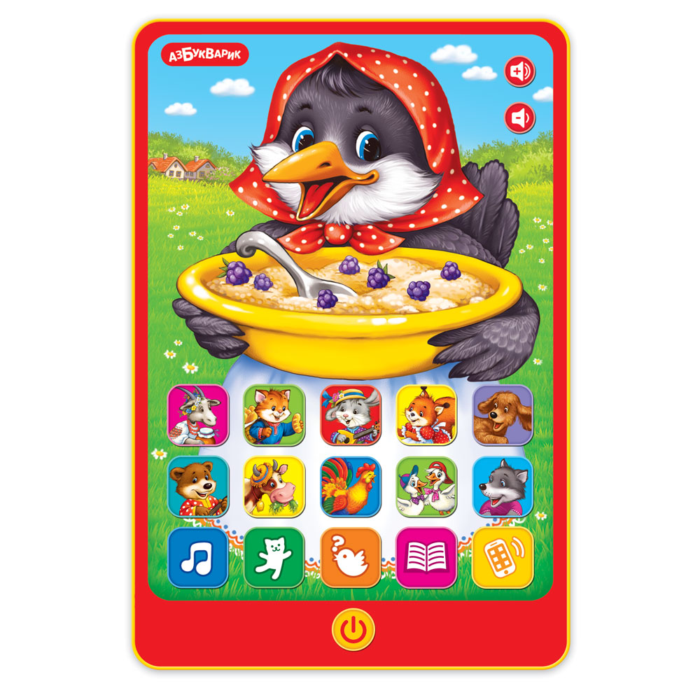 В этом говорящем планшетике с яркой привлекательной картинкой собрано 5 сказок ("Гуси-лебеди", "Петушок и бобовое зернышко", "Курочка Ряба", "Кот, петух и лиса", "Теремок") и 12 весёлых потешек ("Ладушки", "Идёт коза рогатая", "Пошёл котик на торжок", "Заинька, попляши!", "Мишка косолапый", "Петушок" и другие). Нажимай, слушай, подпевай любимым героям! Угадывай голоса зверюшек! Громкость звука регулируется.
