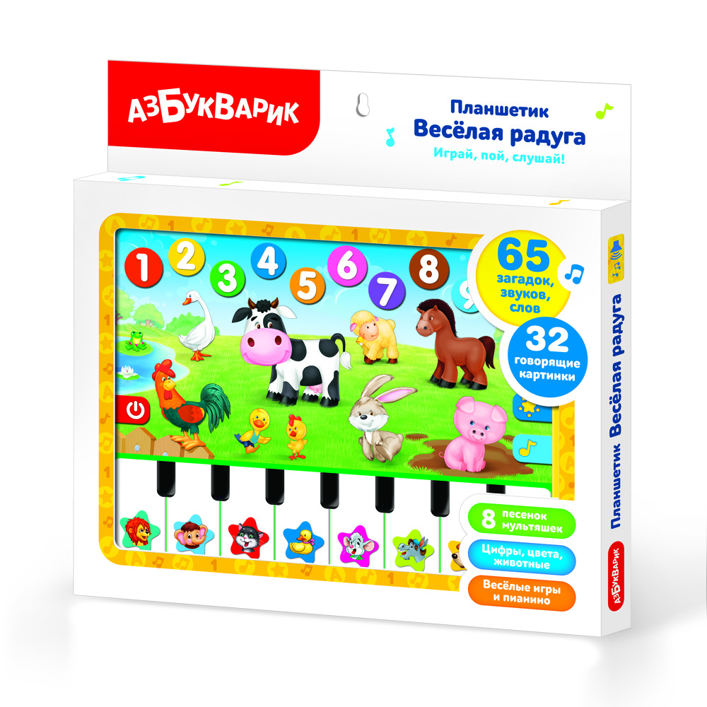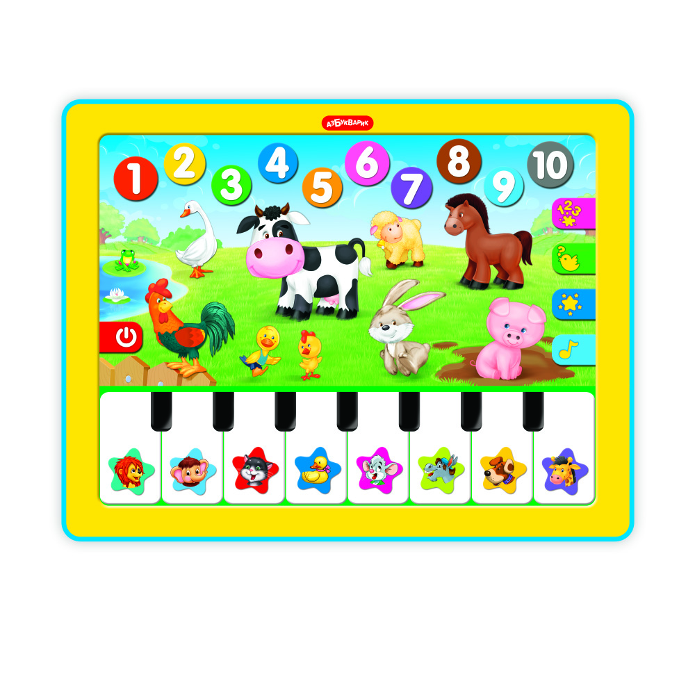 Вот это да! Игровой планшетик теперь с пианино! Нажимая на яркие картинки, ребёнок выучит цифры и цвета, познакомится с животными фермы, отгадает загадки.